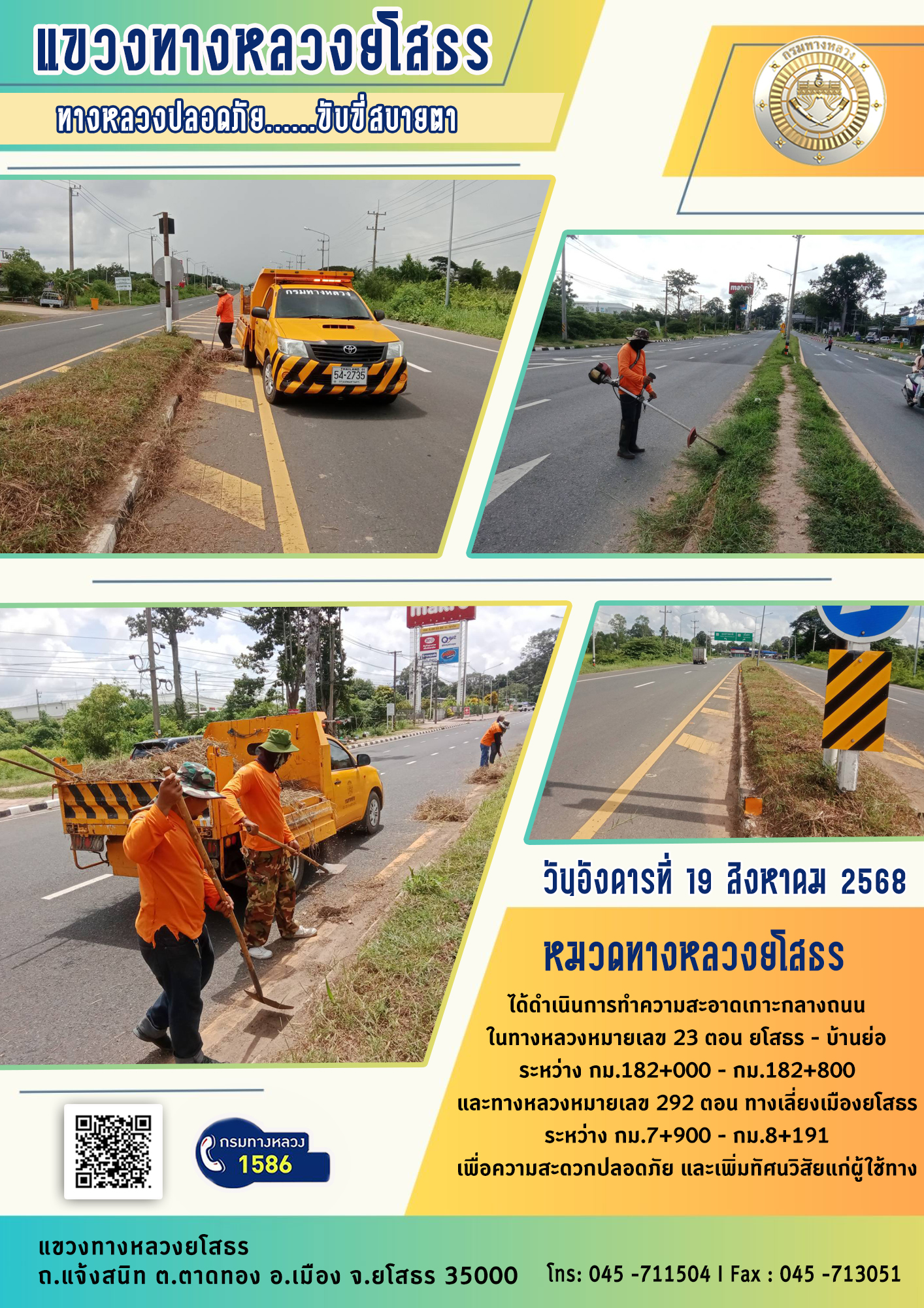 วันอังคารที่ 19 สิงหาคม 2568 หมวดทางหลวงยโสธร ได้ดำเนินการทำความสะอาดเกาะกลางถนน ในทางหลวงหมายเลข 23 ตอน ยโสธร - บ้านย่อ ระหว่าง กม.182+000 - กม.182+800 และทางหลวงหมายเลข 292 ตอน ทางเลี่ยงเมืองยโสธร ระหว่าง กม.7+900 - กม.8+191 เพื่อความสะดวกปลอดภัย