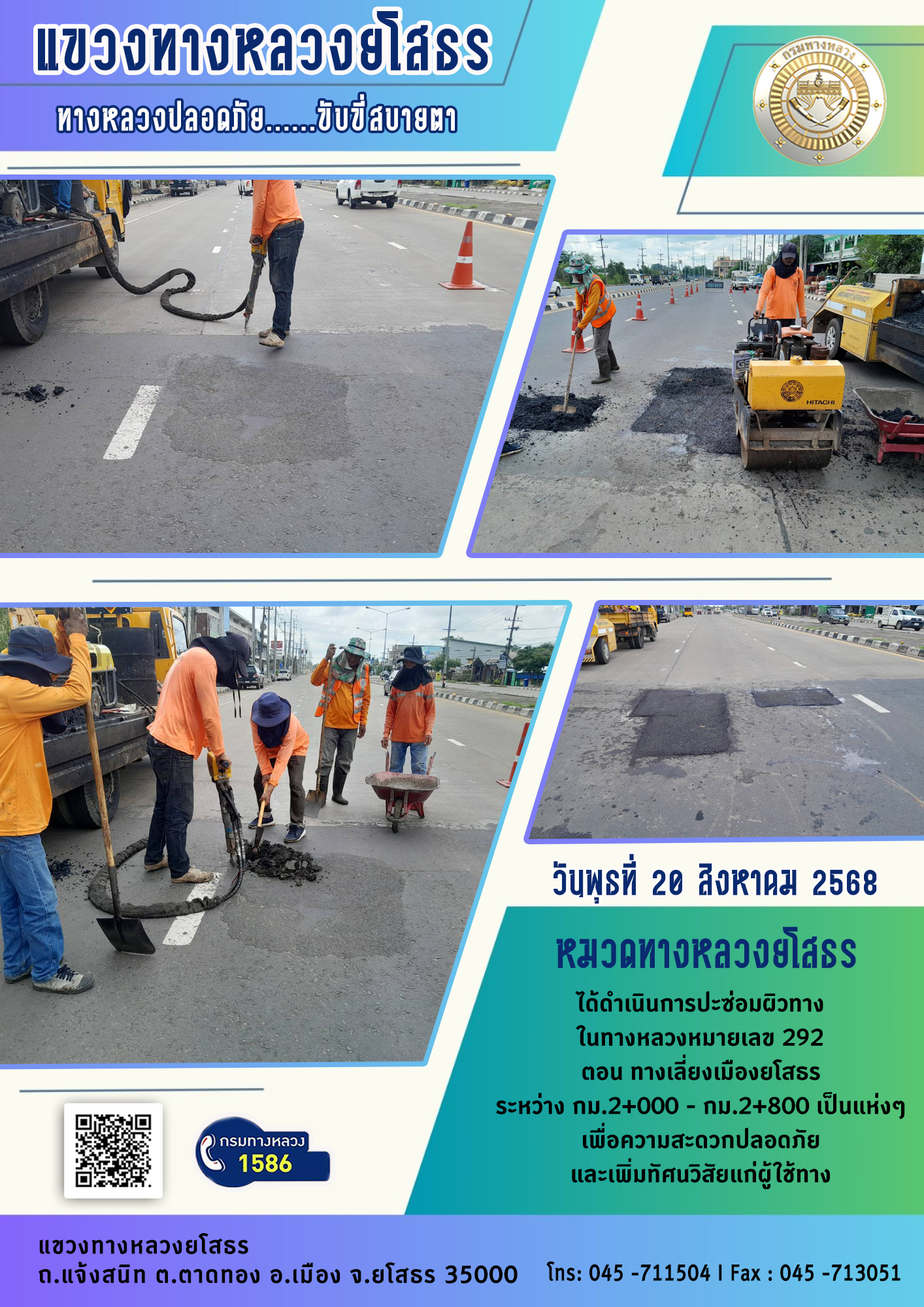 วันพุธที่ 20 สิงหาคม 2568 หมวดทางหลวงยโสธร ได้ดำเนินการปะซ่อมผิวทาง ในทางหลวงหมายเลข 292 ตอน ทางเลี่ยงเมืองยโสธร ระหว่าง กม.2+000 - กม.2+800 เป็นแห่งๆ เพื่อความสะดวกปลอดภัย และเพิ่มทัศนวิสัยแก่ผู้ใช้ทาง