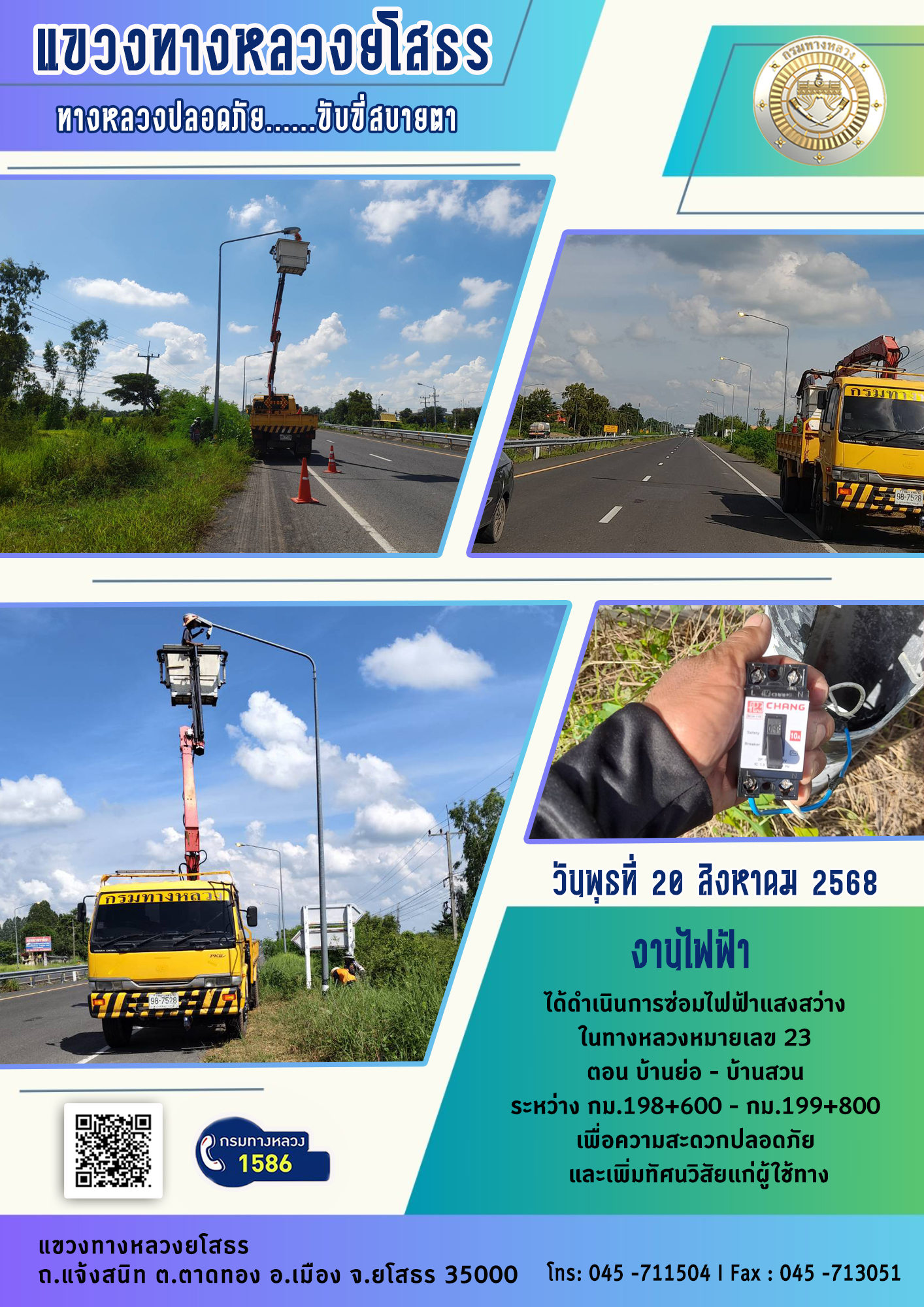 วันพุธที่ 20 สิงหาคม 2568 งานไฟฟ้า ได้ดำเนินการซ่อมไฟฟ้าแสงสว่าง ในทางหลวงหมายเลข 23 ตอน บ้านย่อ - บ้านสวน ระหว่าง กม.198+600 - กม.199+800 เพื่อความสะดวกปลอดภัย และเพิ่มทัศนวิสัยแก่ผู้ใช้ทาง