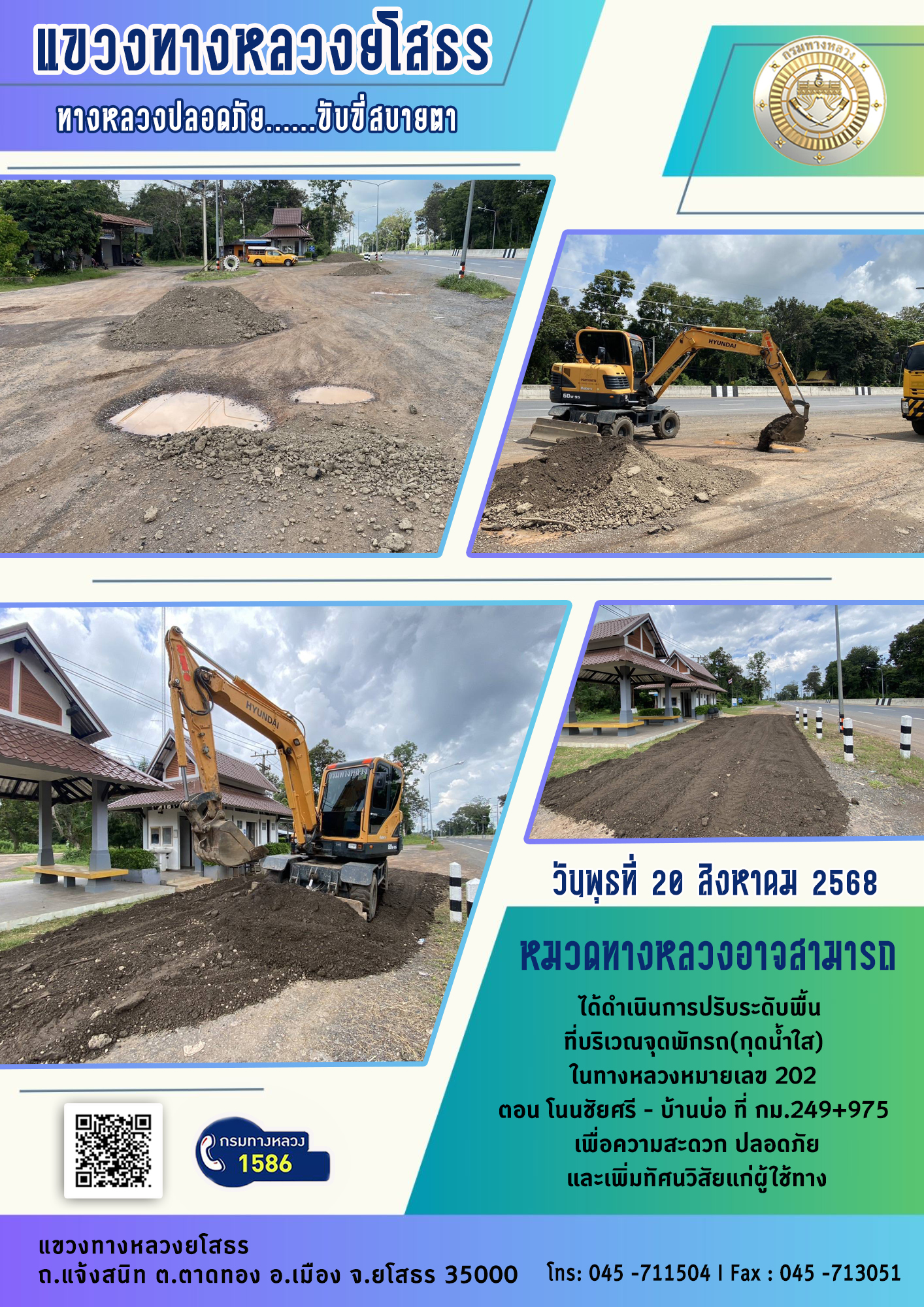 วันพุธที่ 20 สิงหาคม 2568 หมวดทางหลวงอาจสามารถ ได้ดำเนินการปรับระดับพื้น ที่บริเวณจุดพักรถ (กุดน้ำใส) ในทางหลวงหมายเลข 202 ตอน โนนชัยศรี - บ้านบ่อ ที่ กม.249+975 เพื่อความสะดวก ปลอดภัย และเพิ่มทัศนวิสัยแก่ผู้ใช้ทาง