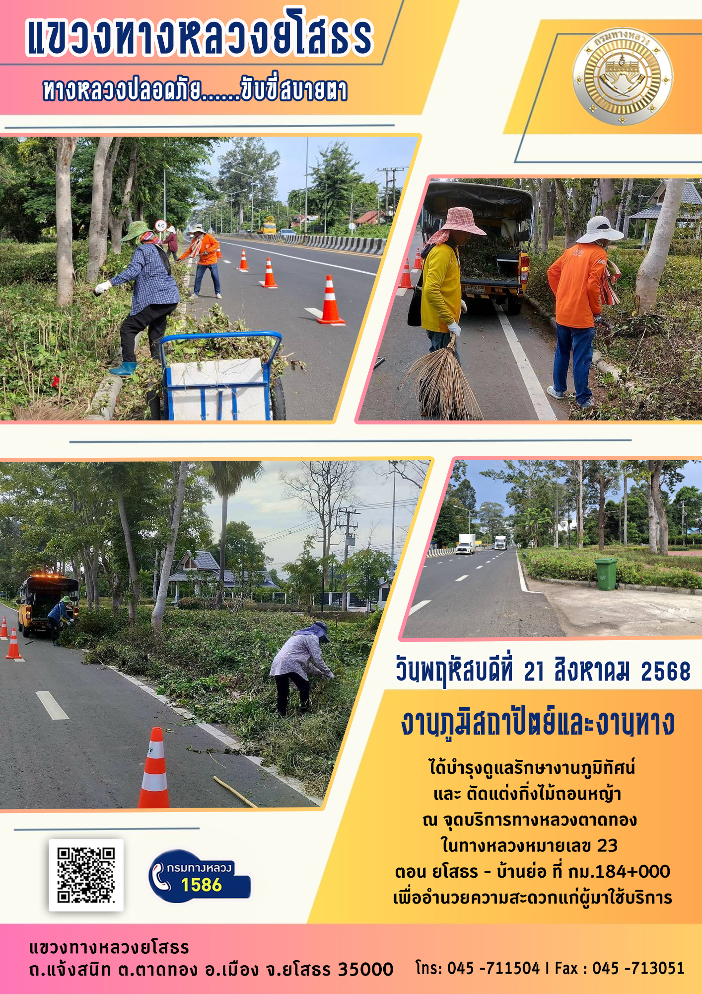 วันพฤหัสบดีที่ 21 สิงหาคม 2568 งานภูมิสถาปัตย์และงานทาง ได้บำรุงดูแลรักษางานภูมิทัศน์ และตัดแต่งกิ่งไม้ถอนหญ้า ณ จุดบริการทางหลวงตาดทอง ในทางหลวงหมายเลข 23 ตอน ยโสธร - บ้านย่อ ที่ กม.184+000 เพื่ออำนวยความสะดวกแก่ผู้มาใช้บริการ