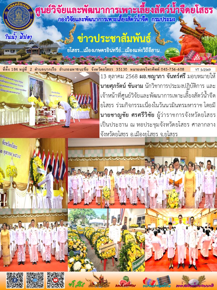 นายศุภรัตน์ ขันงาม นักวิชาการประมงปฏิบัติการ และเจ้าหน้าที่ศูนย์วิจัยและพัฒนาการเพาะเลี้ยงสัตว์น้ำจืดยโสธร ร่วมกิจกรรมเนื่องในวันนวมินทรมหาราช