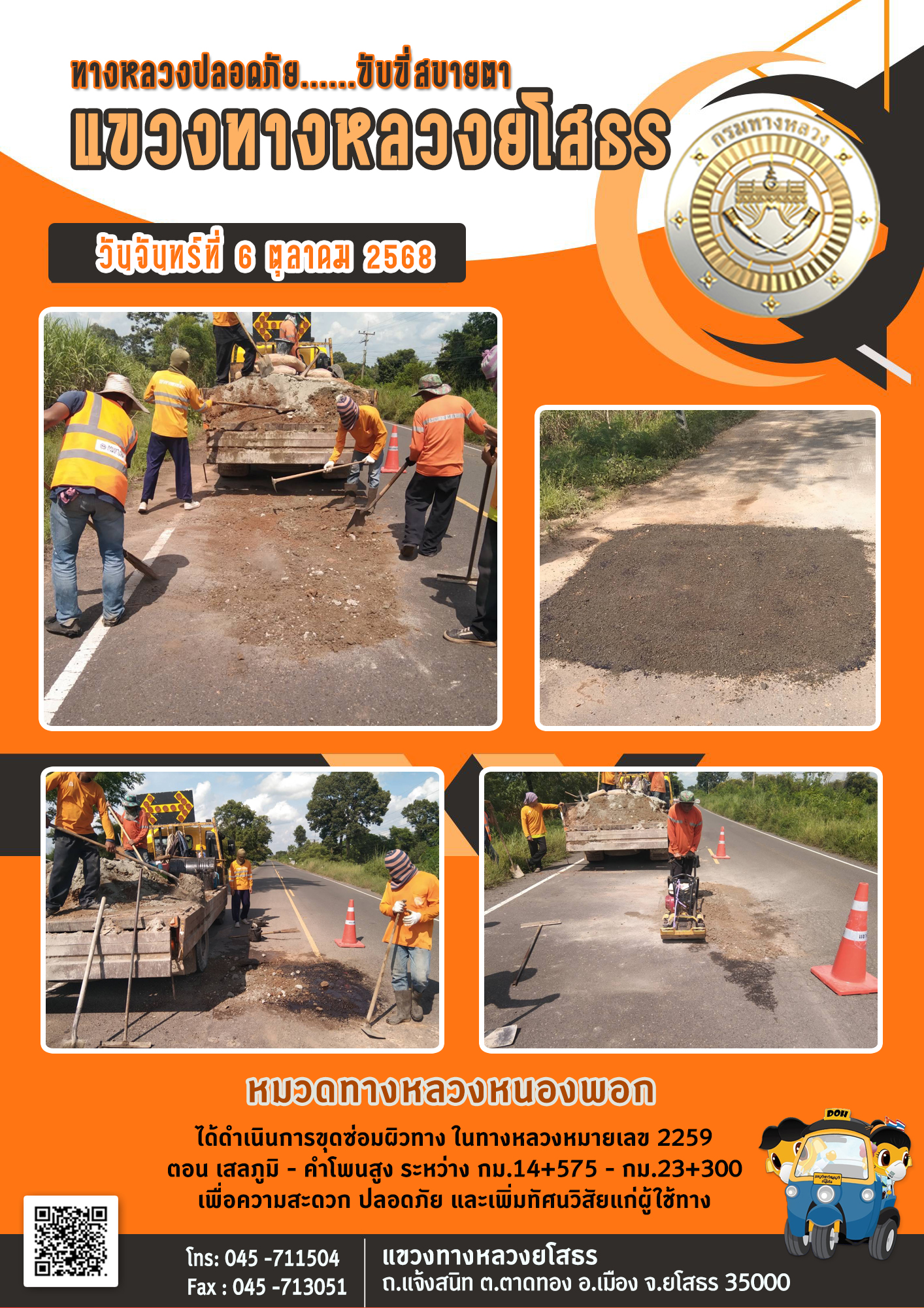 วันจันทร์ที่ 6 ตุลาคม 2568 หมวดทางหลวงหนองพอก ได้ดำเนินการขุดซ่อมผิวทาง ในทางหลวงหมายเลข 2259 ตอน เสลภูมิ - คำโพนสูง ระหว่าง กม.14+575 - กม.23+300 เพื่อความสะดวก ปลอดภัย และเพิ่มทัศนวิสัยแก่ผู้ใช้ทาง