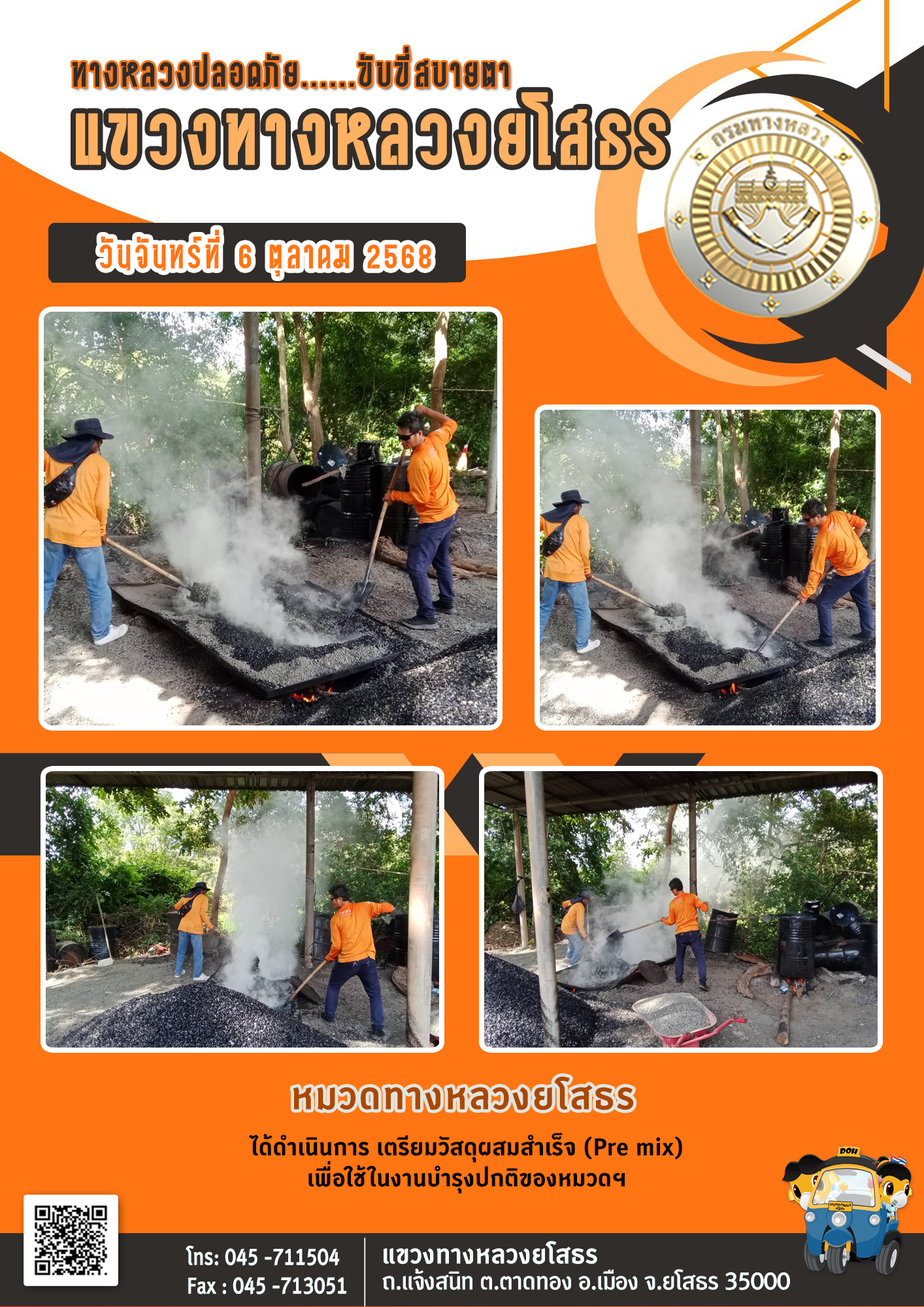 วันจันทร์ที่ 6 ตุลาคม 2568 หมวดทางหลวงยโสธร ได้ดำเนินการ เตรียมวัสดุผสมสำเร็จ (Pre mix) เพื่อใช้ในงานบำรุงปกติของหมวดฯ