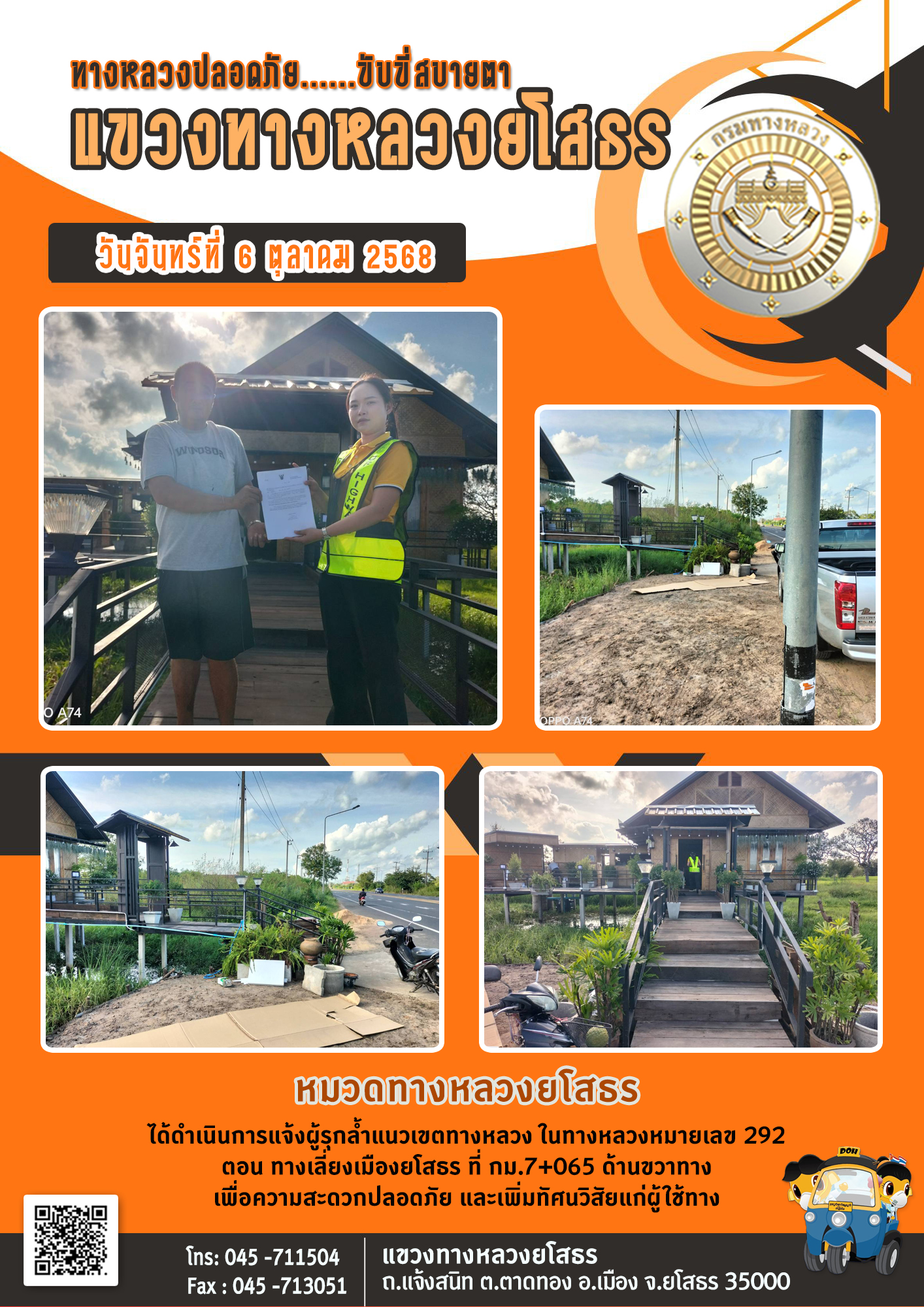 นจันทร์ที่ 6 ตุลาคม 2568 หมวดทางหลวงยโสธร ได้ดำเนินการแจ้งผู้รุกล้ำแนวเขตทางหลวง ในทางหลวงหลวงหนายเลย 292 ตอน ทางเลี่ยงเมืองยโสธร ที่ กม.7+065 ด้านขวาทาง เพื่อความสะดวกปลอดภัย และเพิ่มทัศนวิสัยแก่ผู้ใช้ทาง