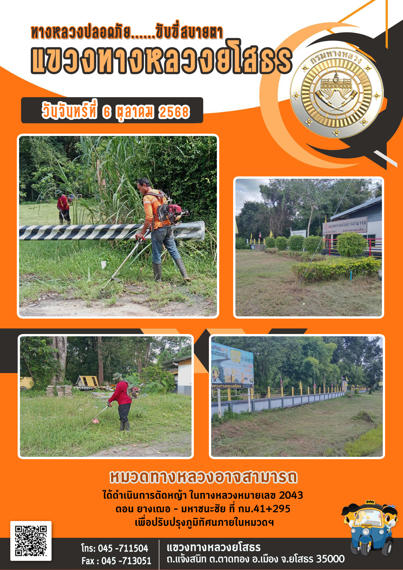วันจันทร์ที่ 6 ตุลาคม 2568 หมวดทางหลวงอาจสามารถ ได้ดำเนินการตัดหญ้า ในทางหลวงหมายเลข 2043 ตอน ยางเฌอ - มหาชนะชัย ที่ กม.41+295 เพื่อปรับปรุงภูมิทัศน์ภายในหมวดฯ