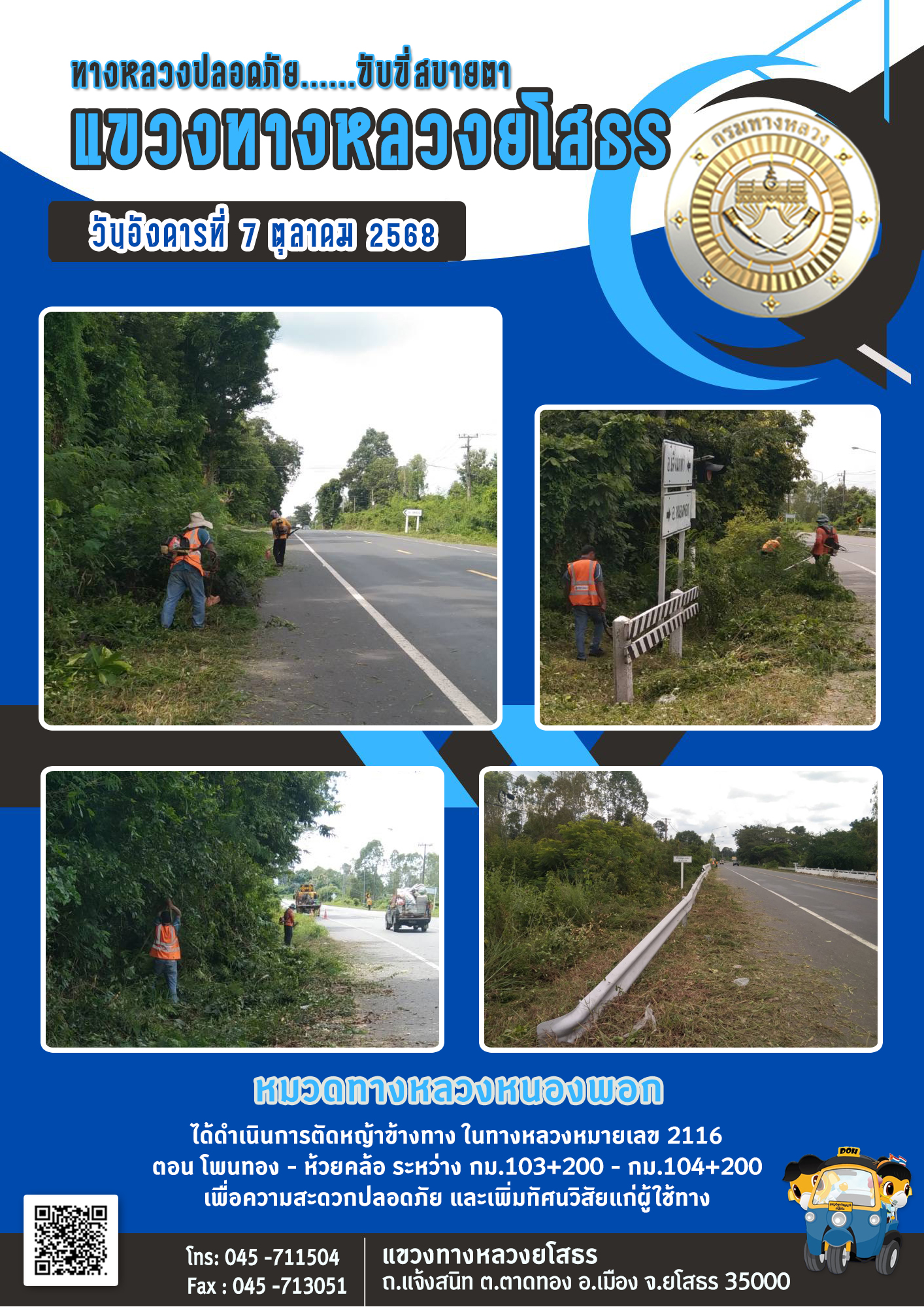 นอังคารที่ 7 ตุลาคม 2568 หมวดทางหลวงหนองพอก ได้ดำเนินการตัดหญ้าข้างทาง ในทางหลวงหมายเลข 2116 ตอน โพนทอง - ห้วยคล้อ ระหว่าง กม.103+200 - กม.104+200 เพื่อความสะดวกปลอดภัย และเพิ่มทัศนวิสัยแก่ผู้ใช้ทาง