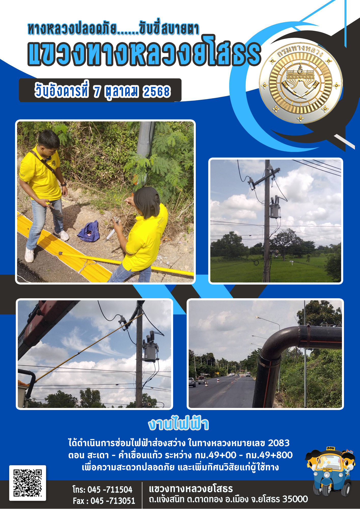 วันอังคารที่ 7 ตุลาคม 2568 งานไฟฟ้า ได้ดำเนินการซ่อมไฟฟ้าส่องสว่าง ในทางหลวงหมายเลข 2083 ตอน สะเดา - คำเขื่อนแก้ว ระหว่าง กม.49+000 - กม.49+800 เพื่อความสะดวกปลอดภัย และเพิ่มทัศนวิสัยแก่ผู้ใช้ทาง
