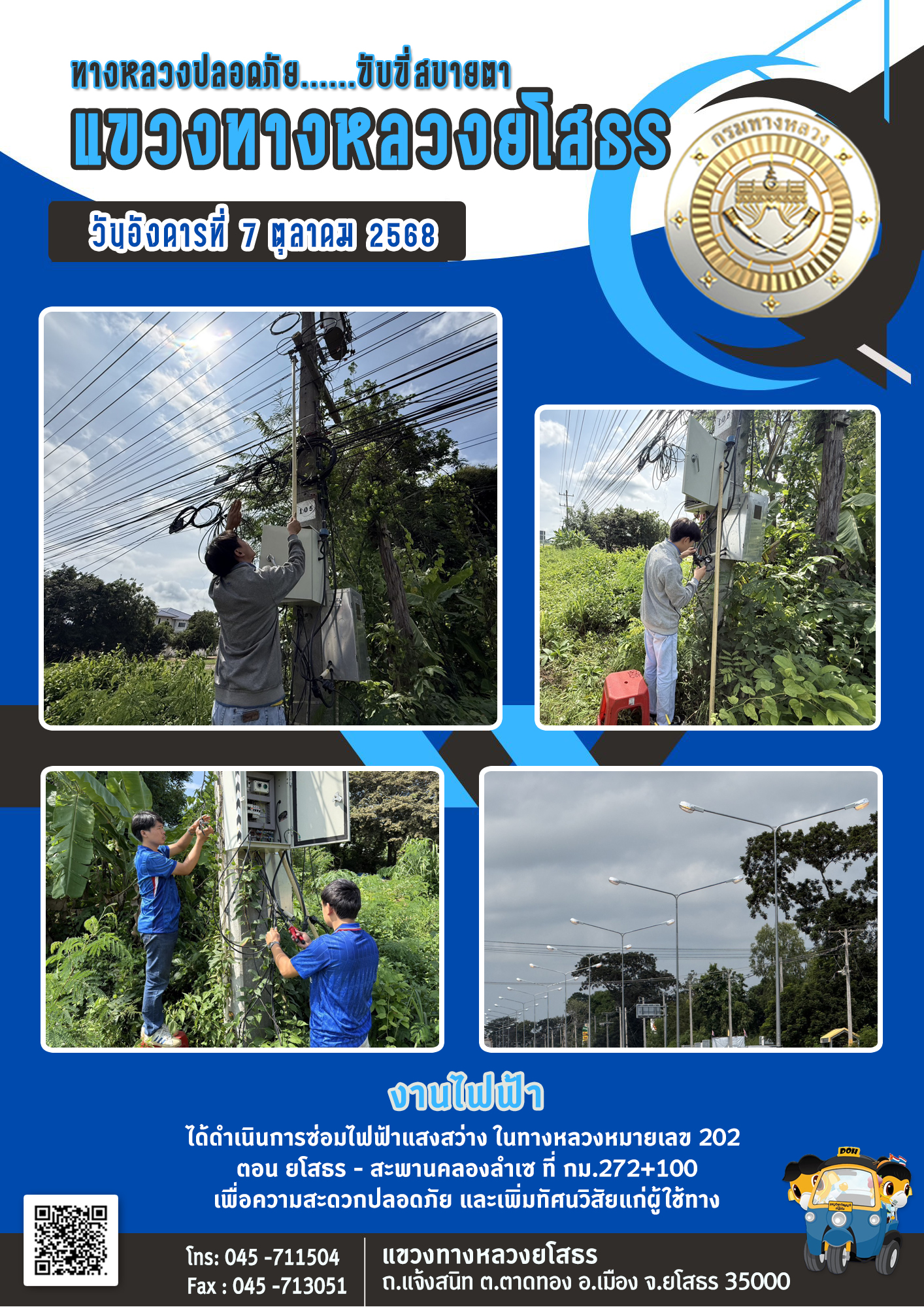 วันอังคารที่ 7 ตุลาคม 2568 งานไฟฟ้า ได้ดำเนินการซ่อมไฟฟ้าแสงสว่าง ในทางหลวงหมายเลข 202 ตอน ยโสธร - สะพานคลองลำเซ ที่ กม.272+100 เพื่อความสะดวกปลอดภัย และเพิ่มทัศนวิสัยแก่ผู้ใช้ทาง