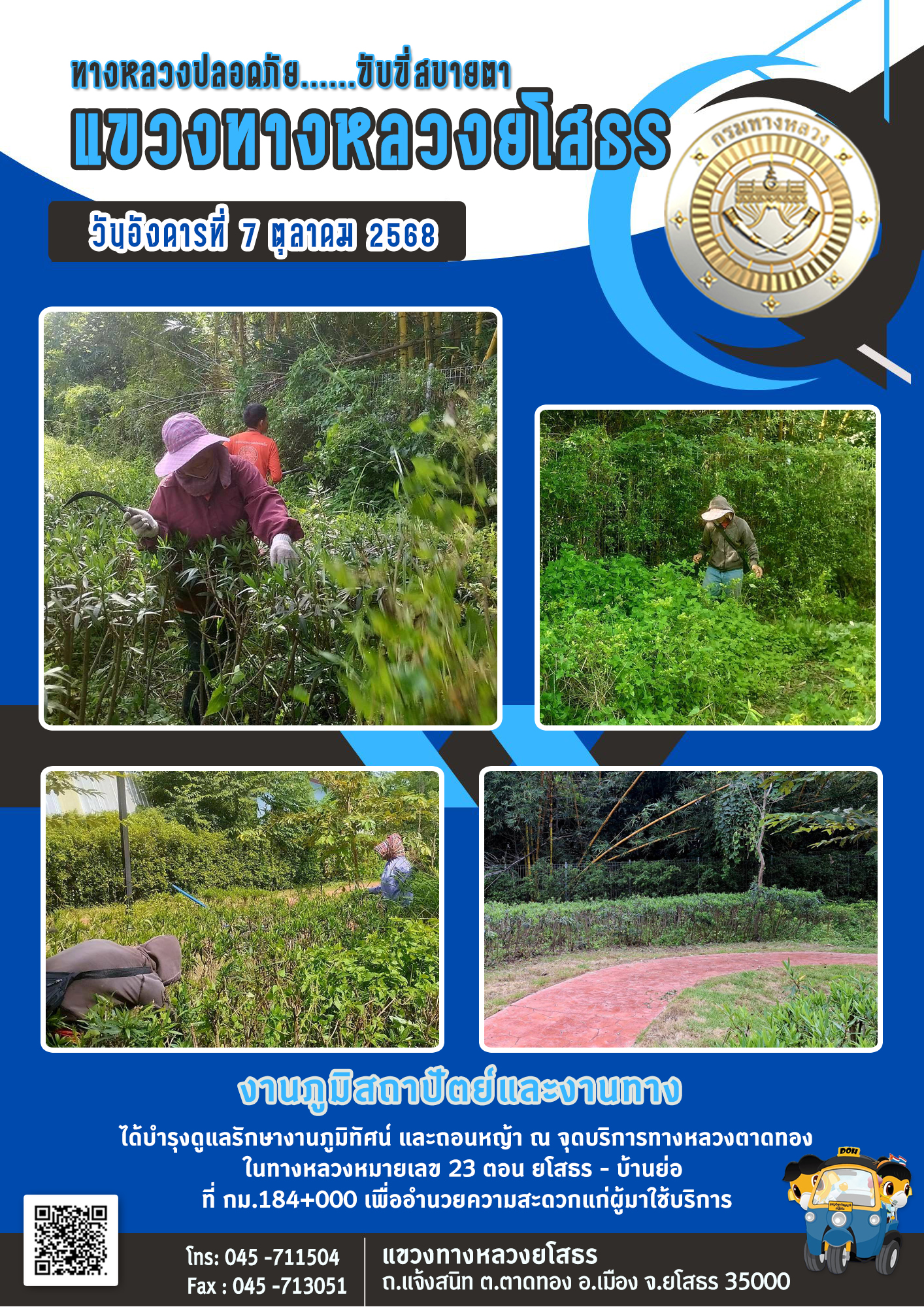 วันอังคารที่ 7 ตุลาคม 2568 งานภูมิสถาปัตย์และงานทาง ได้บำรุงดูแลรักษางานภูมิทัศน์ และถอนหญ้า ณ จุดบริการทางหลวงตาดทอง ในทางหลวงหมายเลข 23 ตอน ยโสธร - บ้านย่อ ที่ กม.184+000 เพื่ออำนวยความสะดวกแก่ผู้มาใช้บริการ