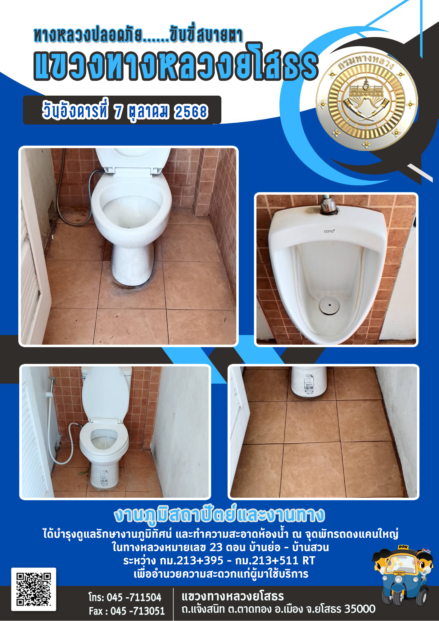 วันอังคารที่ 7 ตุลาคม 2568 งานภูมิสถาปัตย์และงานทาง ได้บำรุงดูแลรักษางานภูมิทัศน์ และทำความสะอาดห้องน้ำ ณ จุดพักรถดงแคนใหญ่ ในทางหลวงหมายเลข 23 ตอน บ้านย่อ - บ้านสวน ระหว่าง กม.213+395 - กม.213+511 RT เพื่ออำนวยความสะดวกแก่ผู้มาใช้บริการ