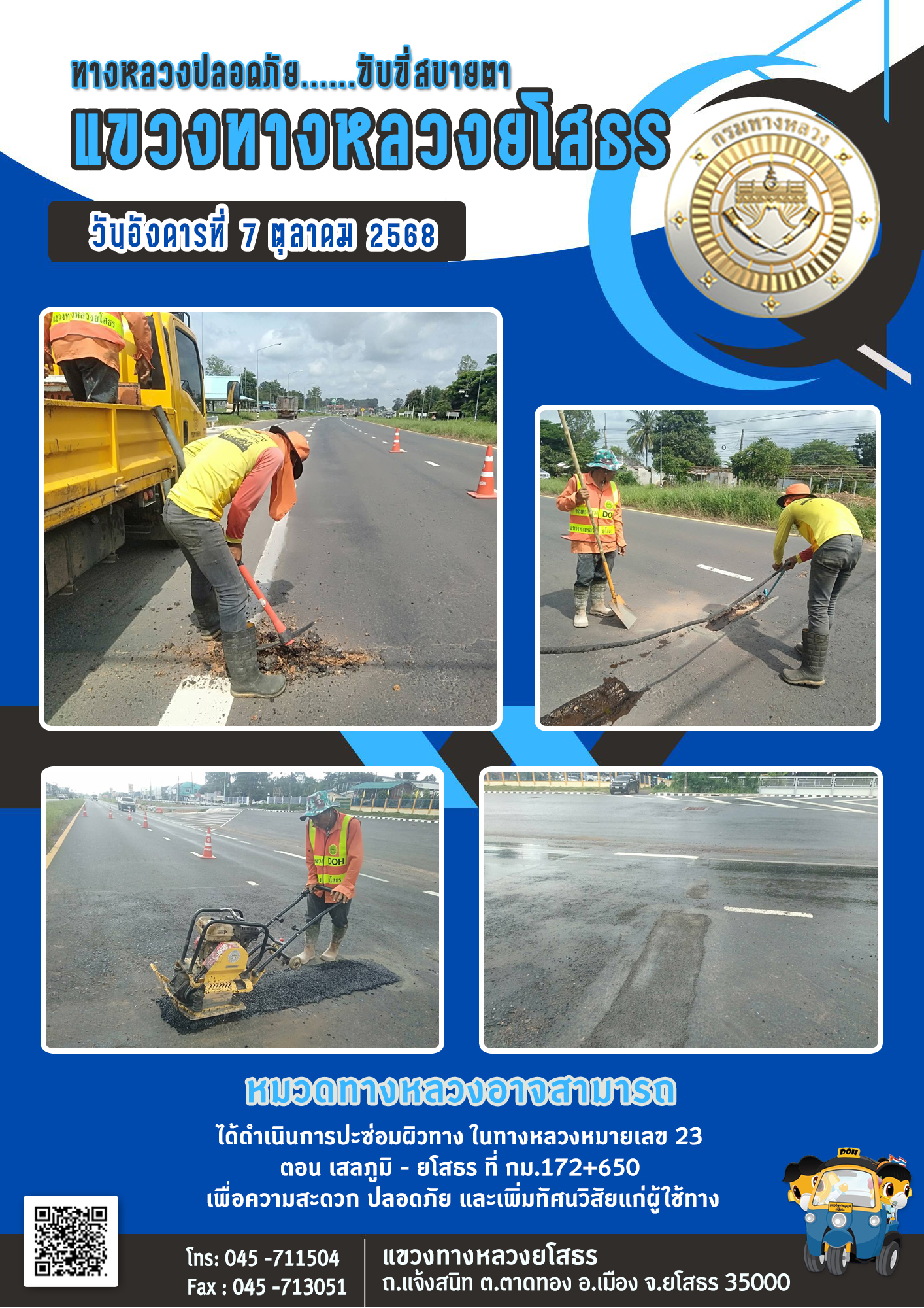 วันอังคารที่ 7 ตุลาคม 2568 หมวดทางหลวงอาจสามารถ ได้ดำเนินการปะซ่อมผิวทาง ในทางหลวงหมายเลข 23 ตอน เสลภูมิ - ยโสธร ที่ กม.172+650 เพื่อความสะดวก ปลอดภัย และเพิ่มทัศนวิสัยแก่ผู้ใช้ทาง