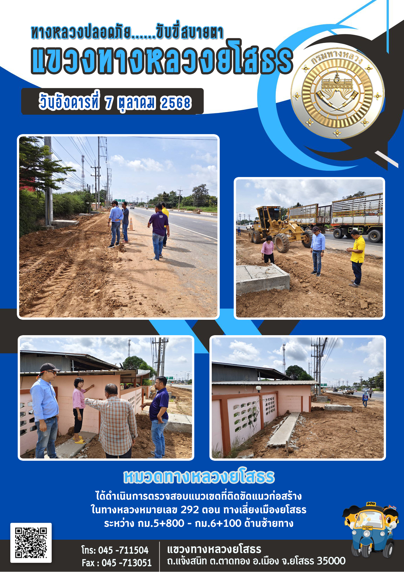 วันอังคารที่ 7 ตุลาคม 2568 หมวดทางหลวงยโสธร ได้ดำเนินการตรวจสอบแนวเขตที่ติดขัดแนวก่อสร้าง ในทางหลวงหมายเลข 292 ตอน ทางเลี่ยงเมืองยโสธร ระหว่าง กม.5+800 - กม.6+100 ด้านซ้ายทาง