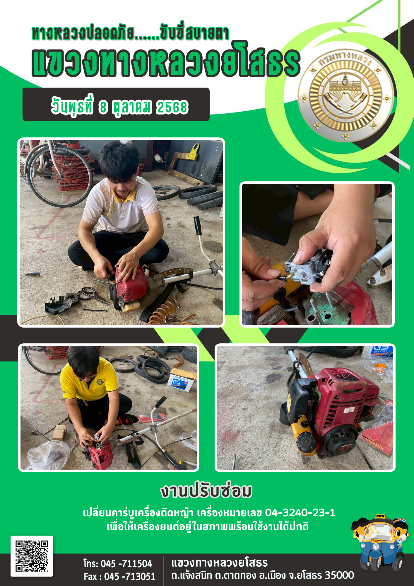 - [10:21] ทั่วไป วันอังคารที่ 31 มีนาคม 2569 งานอำนวยความปลอดภัย ได้ดำเนินการตัดหญ้า ทำความสะอาดภายในบริเวณแขวงทางหลวงยโสธร
