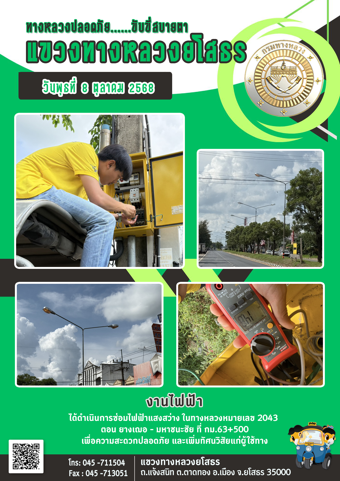 วันพุธที่ 8 ตุลาคม 2568 งานไฟฟ้า ได้ดำเนินการซ่อมไฟฟ้าแสงสว่าง ในทางหลวงหมายเลข 2043 ตอน ยางเฌอ - มหาชนะชัย ที่ กม.63+500 เพื่อความสะดวกปลอดภัย และเพิ่มทัศนวิสัยแก่ผู้ใช้ทาง