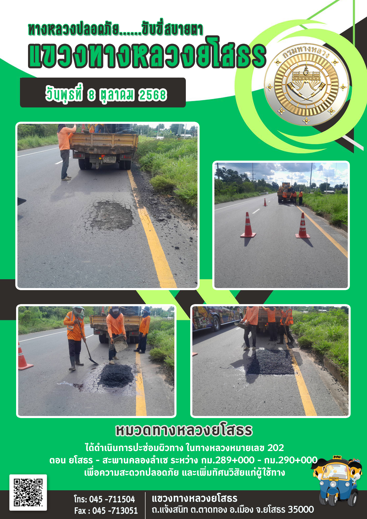 วันพุธที่ 8 ตุลาคม 2568 หมวดทางหลวงยโสธร ได้ดำเนินการปะซ่อมผิวทาง ในทางหลวงหมายเลข 202 ตอน ยโสธร - สะพานคลองลำเซ ระหว่าง กม.289+000 - กม.290+000 เพื่อความสะดวกปลอดภัย และเพิ่มทัศนวิสัยแก่ผู้ใช้ทาง