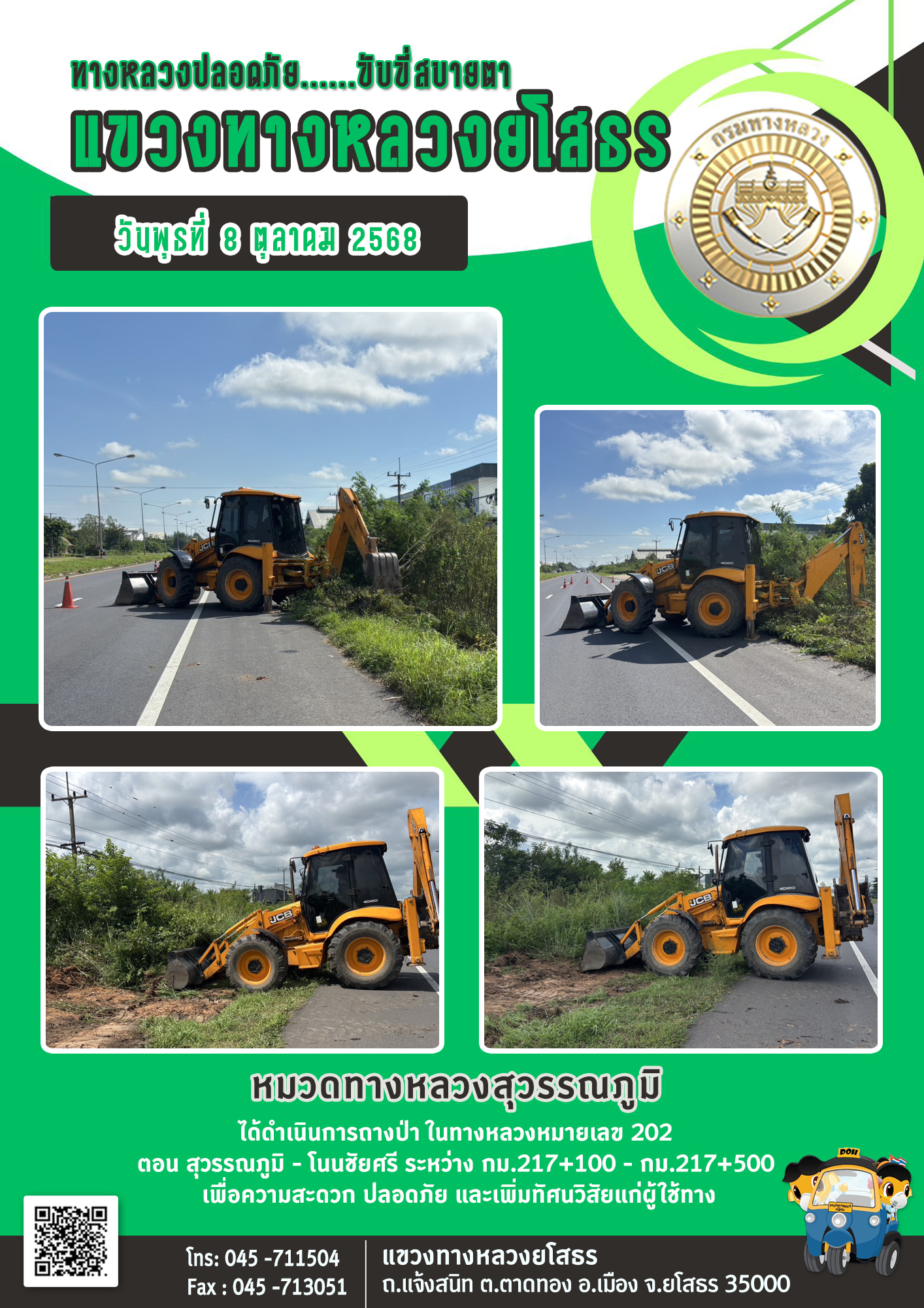 วันพุธที่ 8 ตุลาคม 2568 หมวดทางหลวงสุวรรณภูมิ ได้ดำเนินการถางป่า ในทางหลวงหมายเลข 202 ตอน สุวรรณภูมิ - โนนชัยศรี ระหว่าง กม.217+100 - กม.217+500 เพื่อความสะดวก ปลอดภัย และเพิ่มทัศนวิสัยแก่ผู้ใช้ทาง