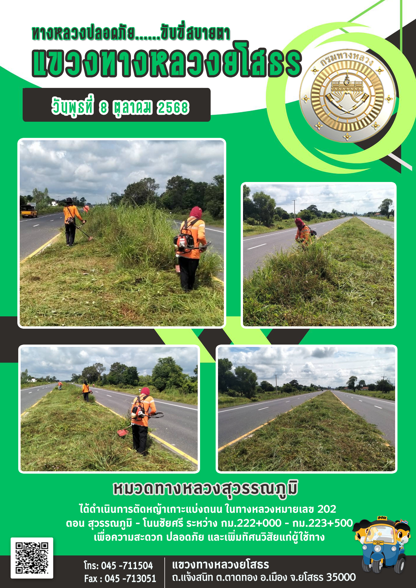 วันพุธที่ 8 ตุลาคม 2568 หมวดทางหลวงสุวรรณภูมิ ได้ดำเนินการตัดหญ้าเกาะแบ่งถนน ในทางหลวงหมายเลข 202 ตอน สุวรรณภูมิ - โนนชัยศรี ระหว่าง กม.222+000 - กม.223+500 เพื่อความสะดวก ปลอดภัย และเพิ่มทัศนวิสัยแก่ผู้ใช้ทาง