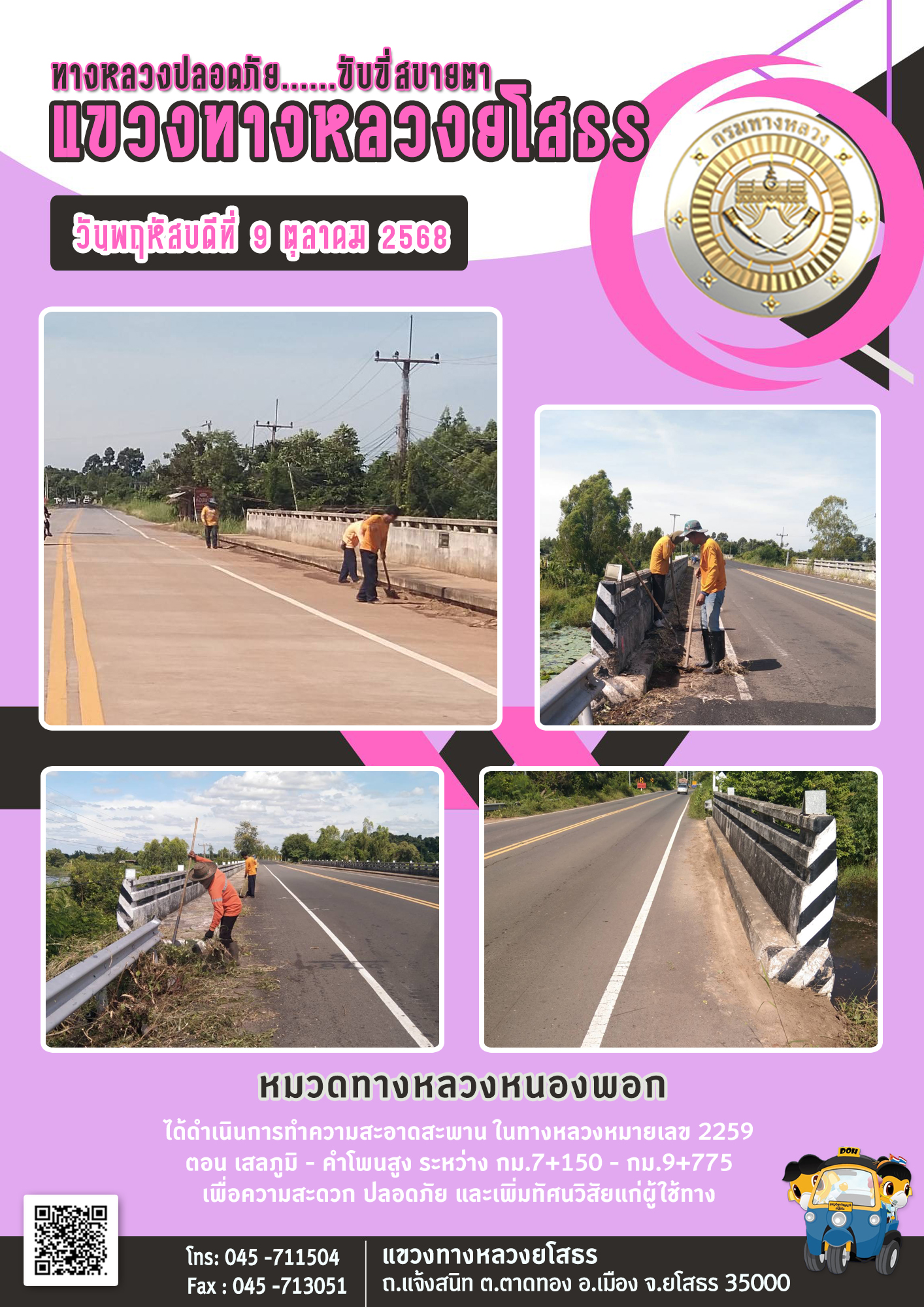 วันพฤหัสบดีที่ 9 ตุลาคม 2568 หมวดทางหลวงหนองพอก ได้ดำเนินการทำความสะอาดสะพาน ในทางหลวงหมายเลข 2259 ตอน เสลภูมิ - คำโพนสูง ระหว่าง กม.7+150 - กม.9+7775 เพื่อความสะดวก ปลอดภัย และเพิ่มทัศนวิสัยแก่ผู้ใช้ทาง