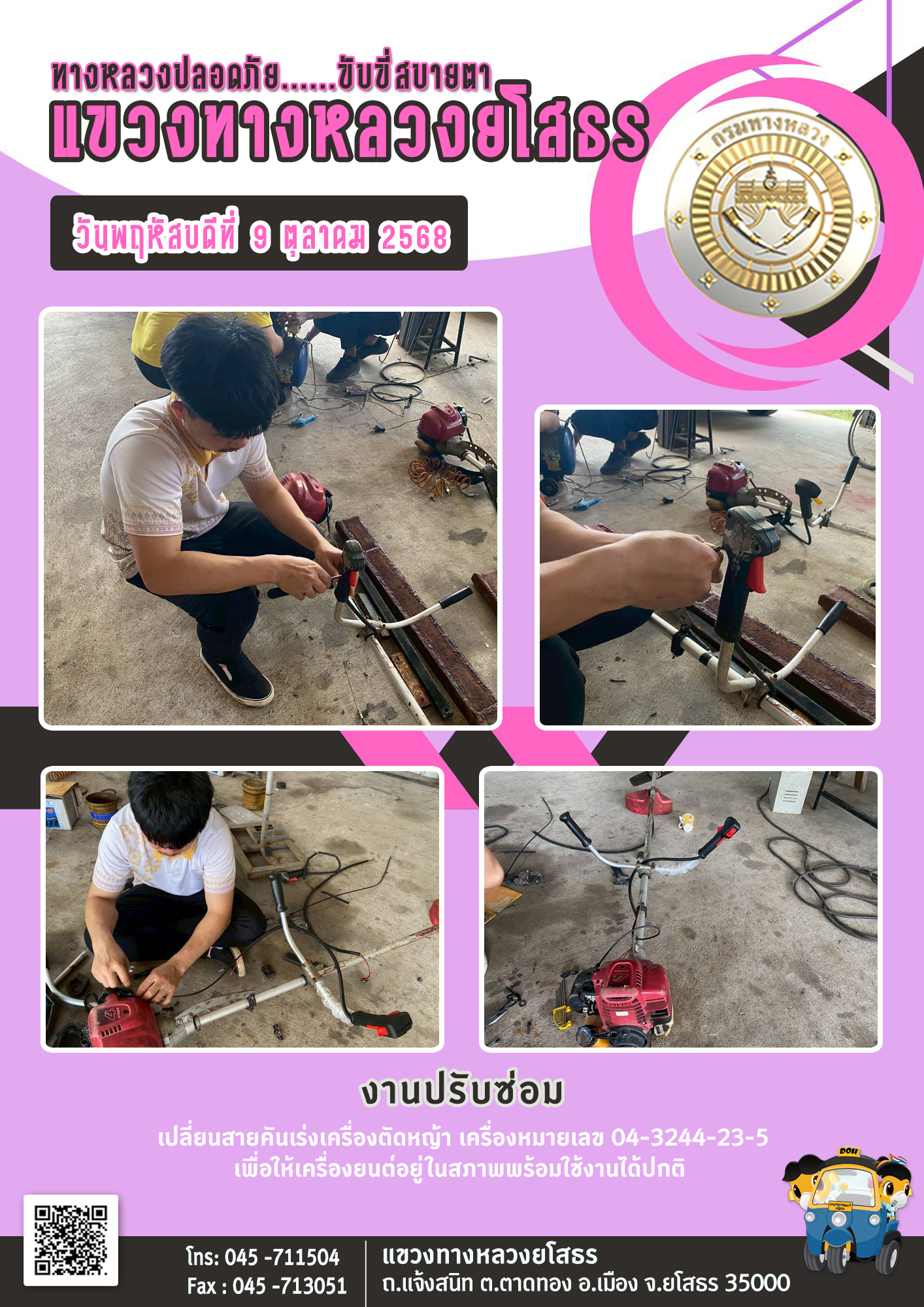 วันพฤหัสบดีที่ 9 ตุลาคม 2568 งานปรับซ่อม ได้ดำเนินการเปลี่ยนสายคันเร่งเครื่องตัดหญ้า เครื่องหมายเลข 04-3244-23-5 เพื่อให้เครื่องยนต์อยู่ในสภาพพร้อมใช้งานได้ปกติ