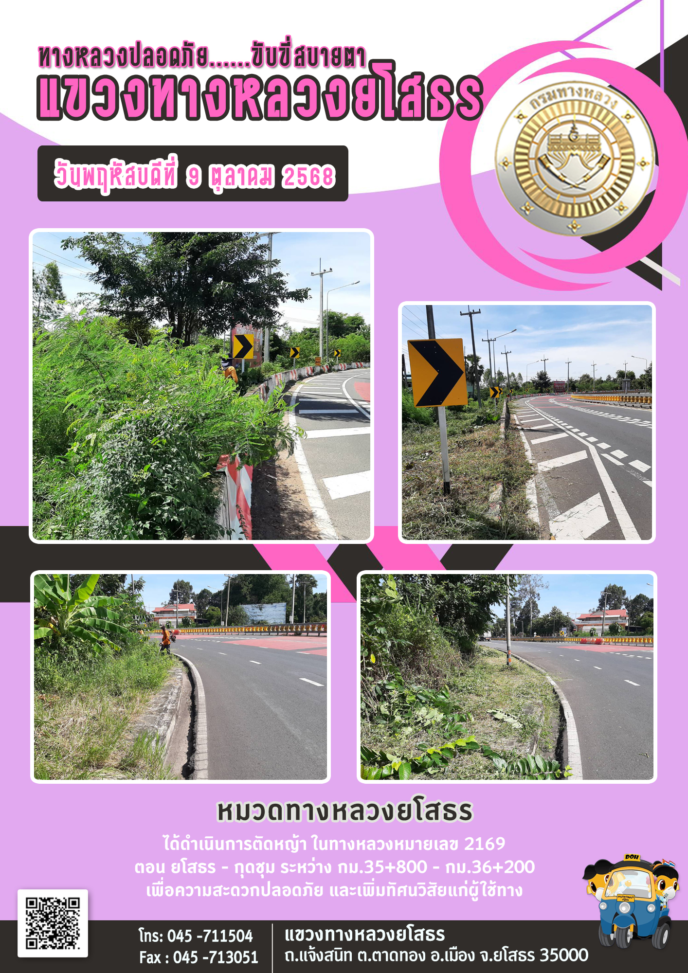 วันพฤหัสบดีที่ 9 ตุลาคม 2568 หมวดทางหลวงยโสธร ได้ดำเนินการตัดหญ้า ในทางหลวงหมายเลข 2169 ตอน ยโสธร - กุดชุม ระหว่าง กม.35+800 - กม.36+200 เพื่อความสะดวกปลอดภัย และเพิ่มทัศนวิสัยแก่ผู้ใช้ทาง
