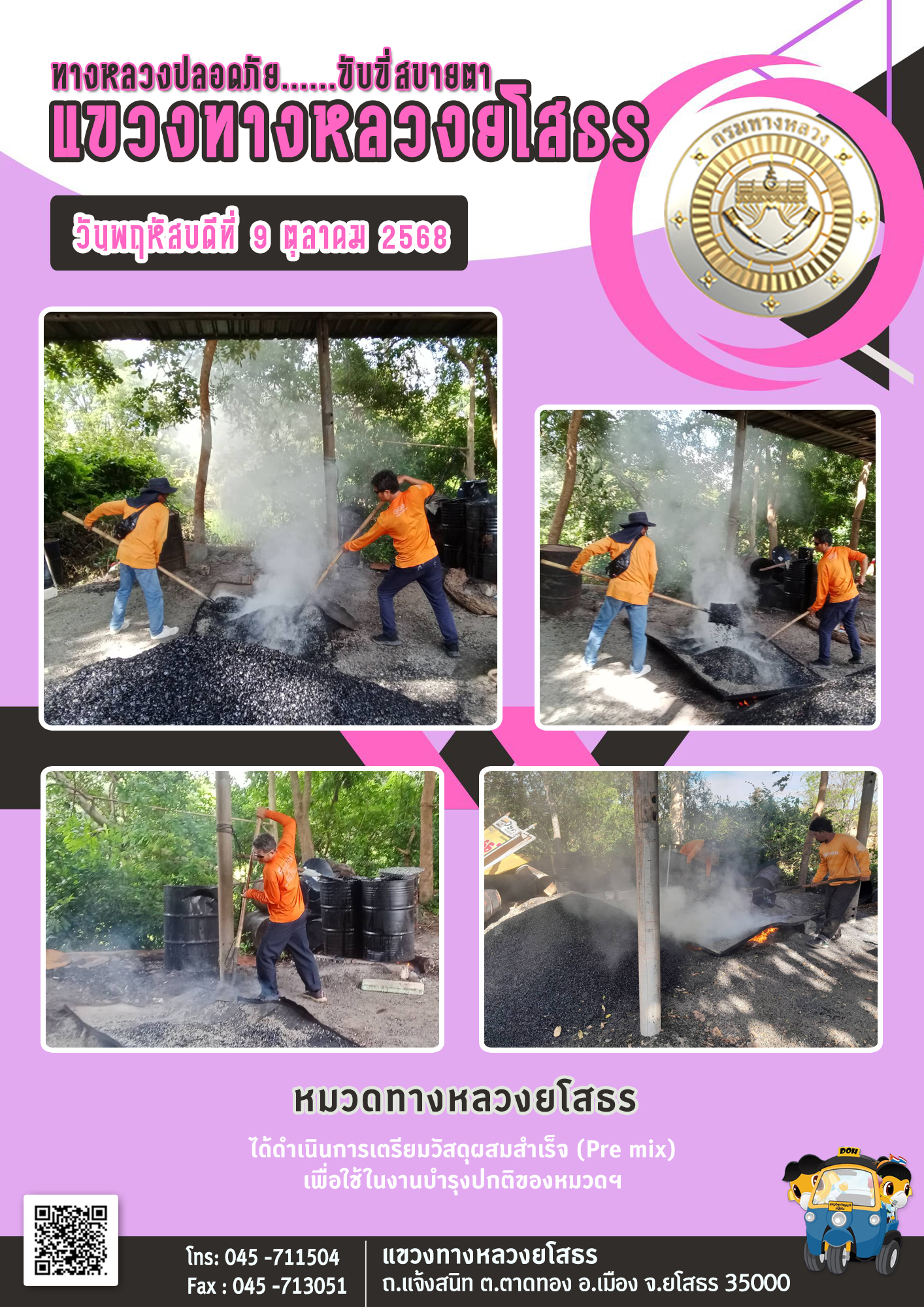 วันพฤหัสบดีที่ 9 ตุลาคม 2568 หมวดทางหลวงยโสธร ได้ดำเนินการเตรียมวัสดุผสมสำเร็จ (Pre mix) เพื่อใช้ในงานบำรุงปกติของหมวดฯ