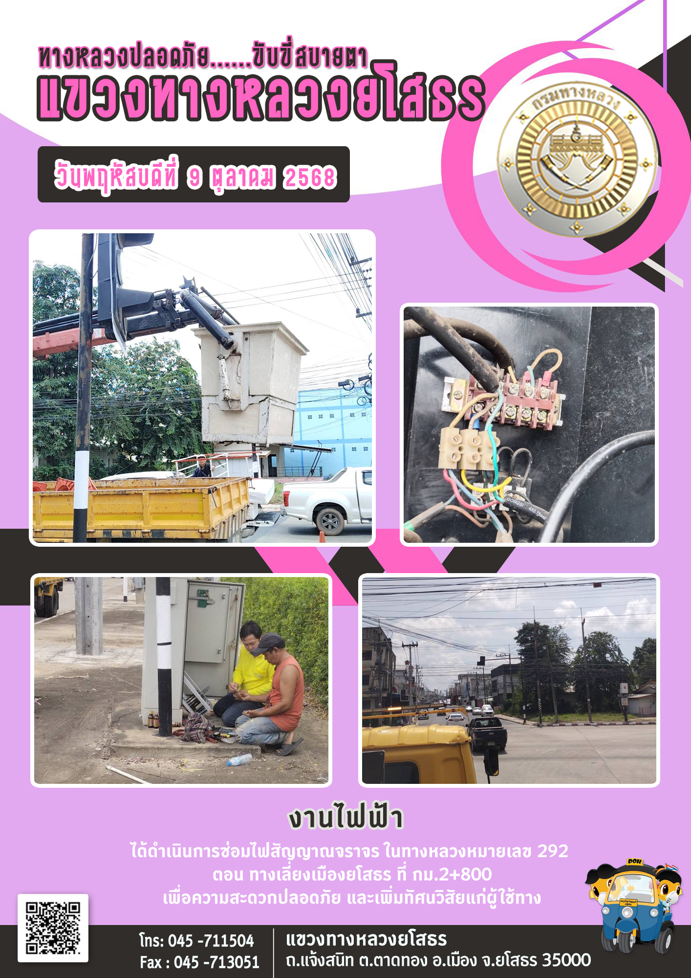วันพฤหัสบดีที่ 9 ตุลาคม 2568 งานไฟฟ้า ได้ดำเนินการซ่อมไฟสัญญาณจราจร ในทางหลวงหมายเลข 292 ตอน ทางเลี่ยงเมืองยโสธร ที่ กม.2+800 เพื่อความสะดวกปลอดภัย และเพิ่มทัศนวิสัยแก่ผู้ใช้ทาง