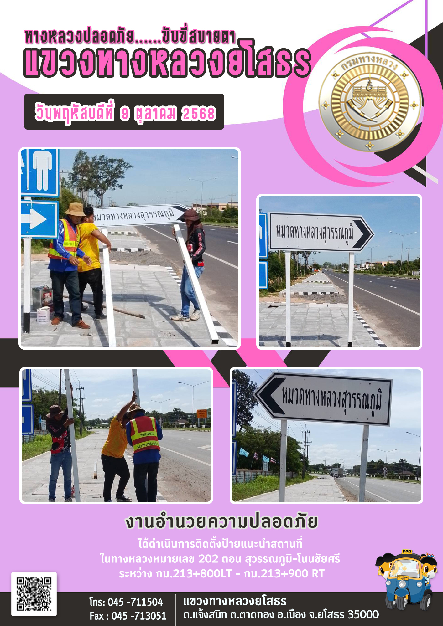 วันพฤหัสบดีที่ 9 ตุลาคม 2568 งานอำนวยความปลอดภัย ได้ดำเนินการติดตั้งป้ายแนะนำสถานที่ ในทางหลวงหมายเลข 202 ตอน สุวรรณภูมิ-โนนชัยศรี ระหว่าง กม.213+800LT - กม.213+900 RT