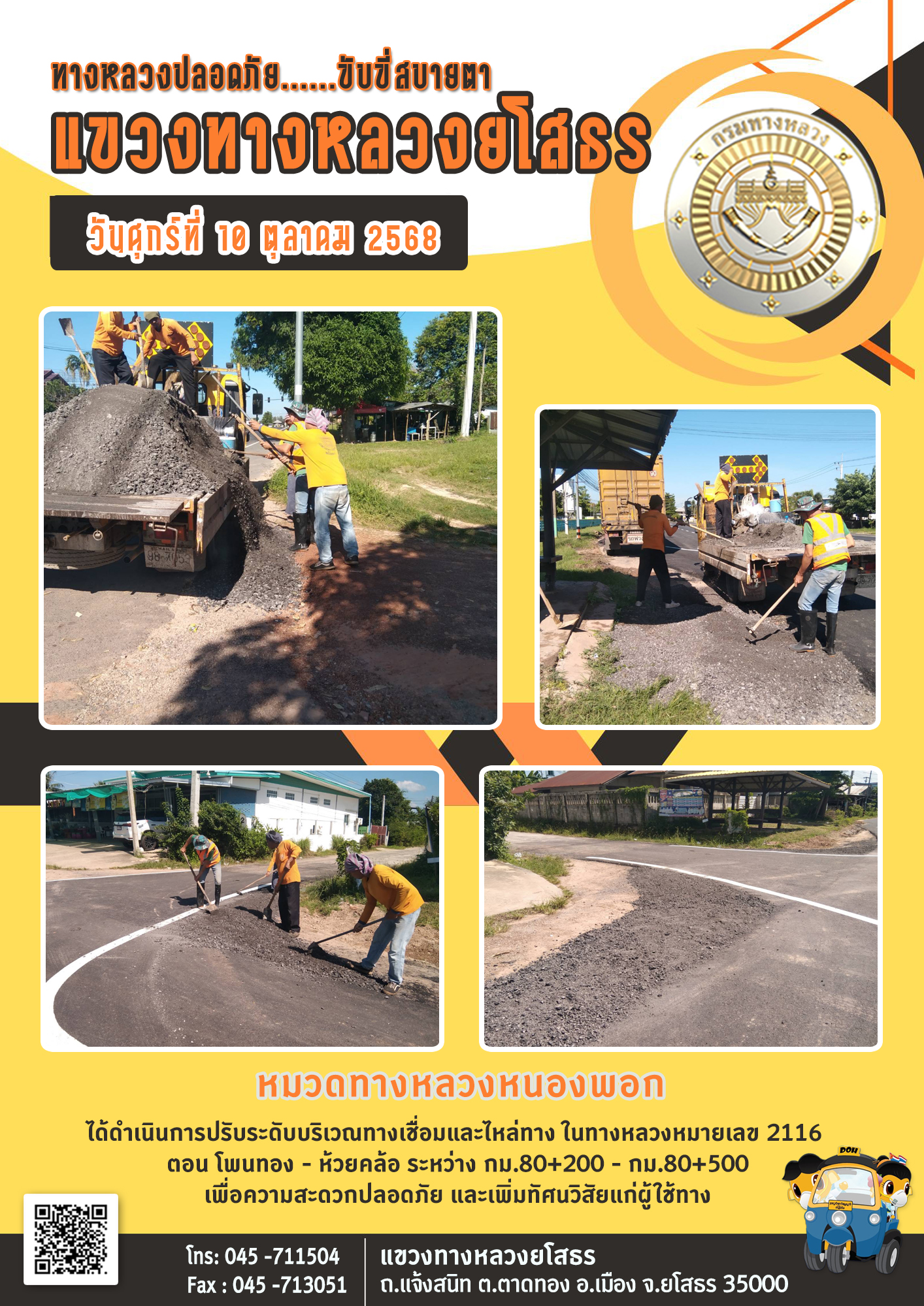 - [10:20] ทั่วไป วันอังคารที่ 31 มีนาคม 2569 หมวดทางหลวงยโสธร ได้ดำเนินการติดตั้งแบบเหล็กเพื่อเตรียมเทเกาะกลางถนน ในทางหลวงหมายเลข 2169 ตอน ยโสธร - กุดชุม ระหว่าง กม.3+000 - กม.3+400 เพื่อความสะดวกปลอดภัย และเพิ่มทัศนวิสัยแก่ผู้ใช้ทาง