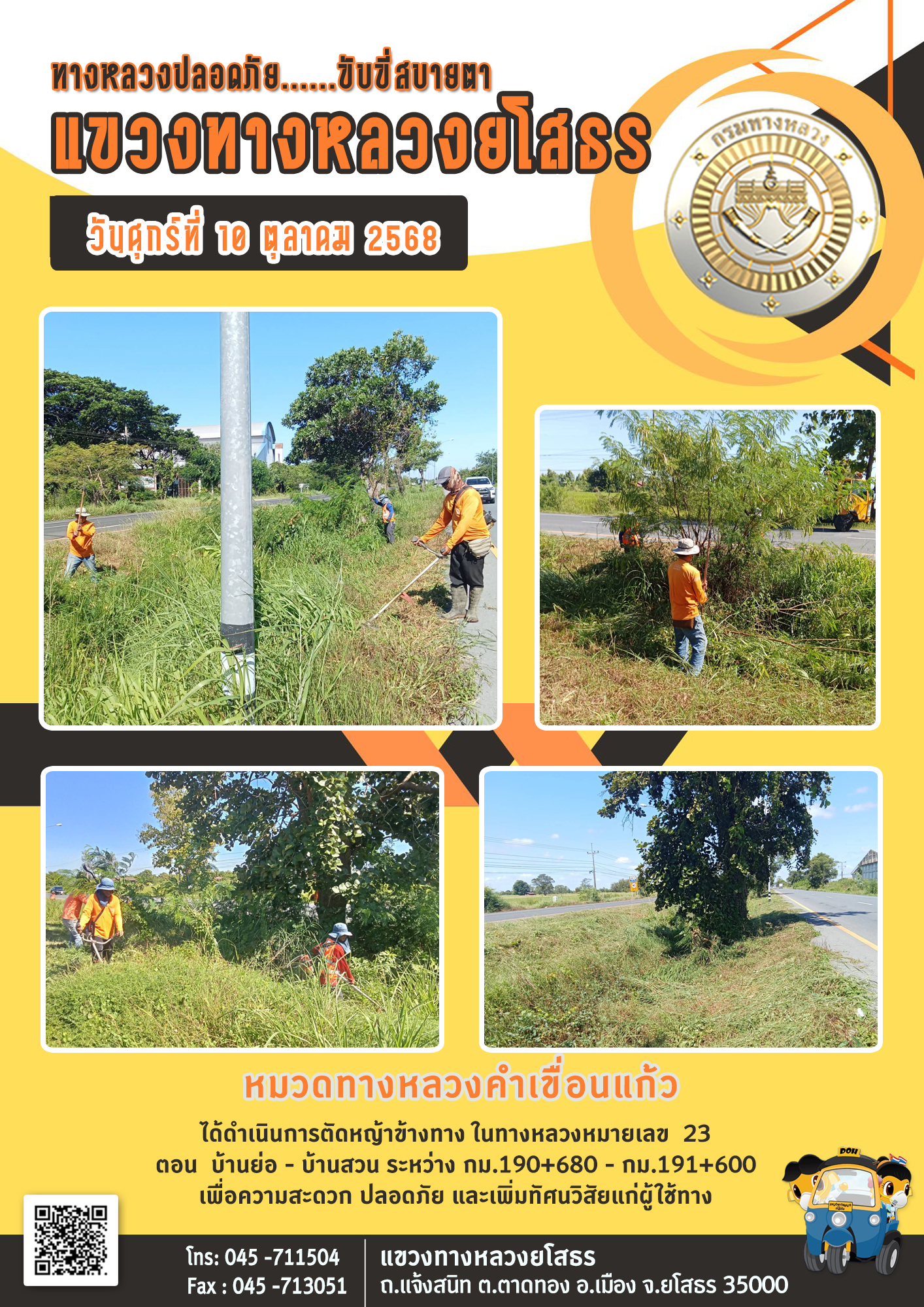 วันศุกร์ที่ 10 ตุลาคม 2568 หมวดทางหลวงคำเขื่อนแก้ว ได้ดำเนินการตัดหญ้าข้างทาง ในทางหลวงหมายเลข 23 ตอน บ้านย่อ - บ้านสวน ระหว่าง กม.190+680 - กม.191+600 เพื่อความสะดวก ปลอดภัย และเพิ่มทัศนวิสัยแก่ผู้ใช้ทาง