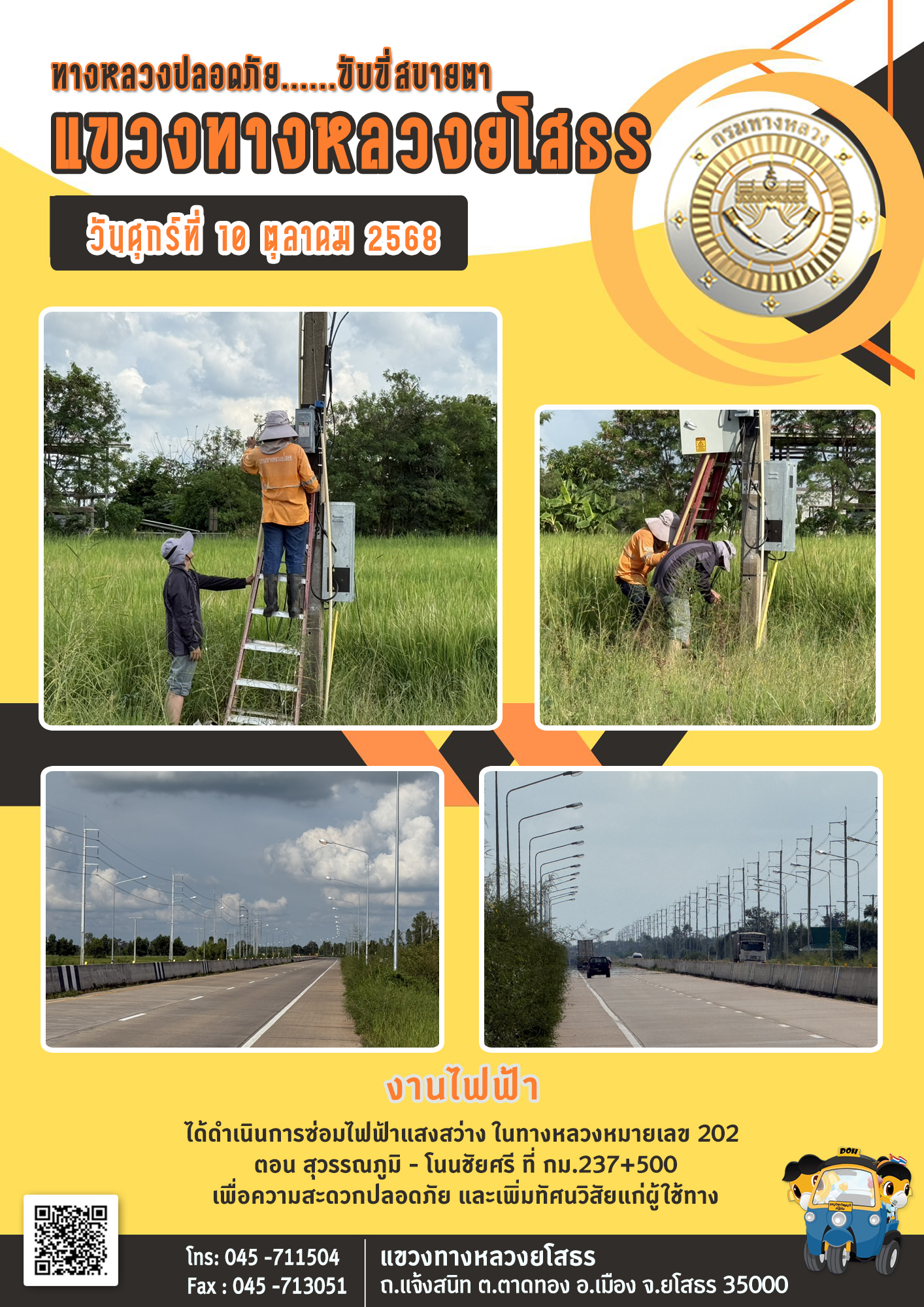 วันศุกร์ที่ 10 ตุลาคม 2568 งานไฟฟ้า ได้ดำเนินการซ่อมไฟฟ้าแสงสว่าง ในทางหลวงหมายเลข 202 ตอน สุวรรณภูมิ - โนนชัยศรี ที่ กม.237+500 เพื่อความสะดวกปลอดภัย และเพิ่มทัศนวิสัยแก่ผู้ใช้ทาง