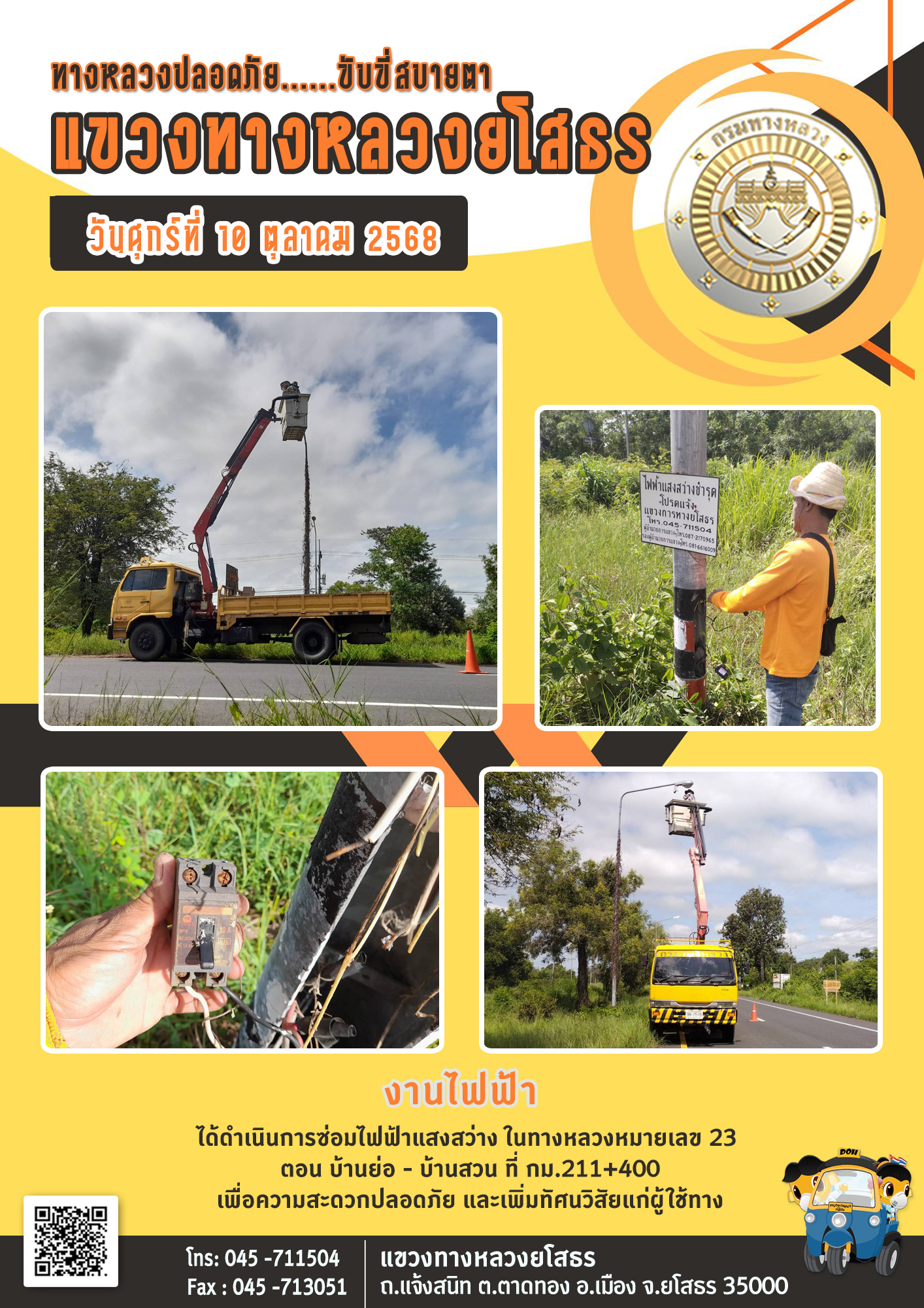 วันศุกร์ที่ 10 ตุลาคม 2568 งานไฟฟ้า ได้ดำเนินการซ่อมไฟฟ้าแสงสว่าง ในทางหลวงหมายเลข 23 ตอน บ้านย่อ - บ้านสวน ที่ กม.211+400 เพื่อความสะดวกปลอดภัย และเพิ่มทัศนวิสัยแก่ผู้ใช้ทาง