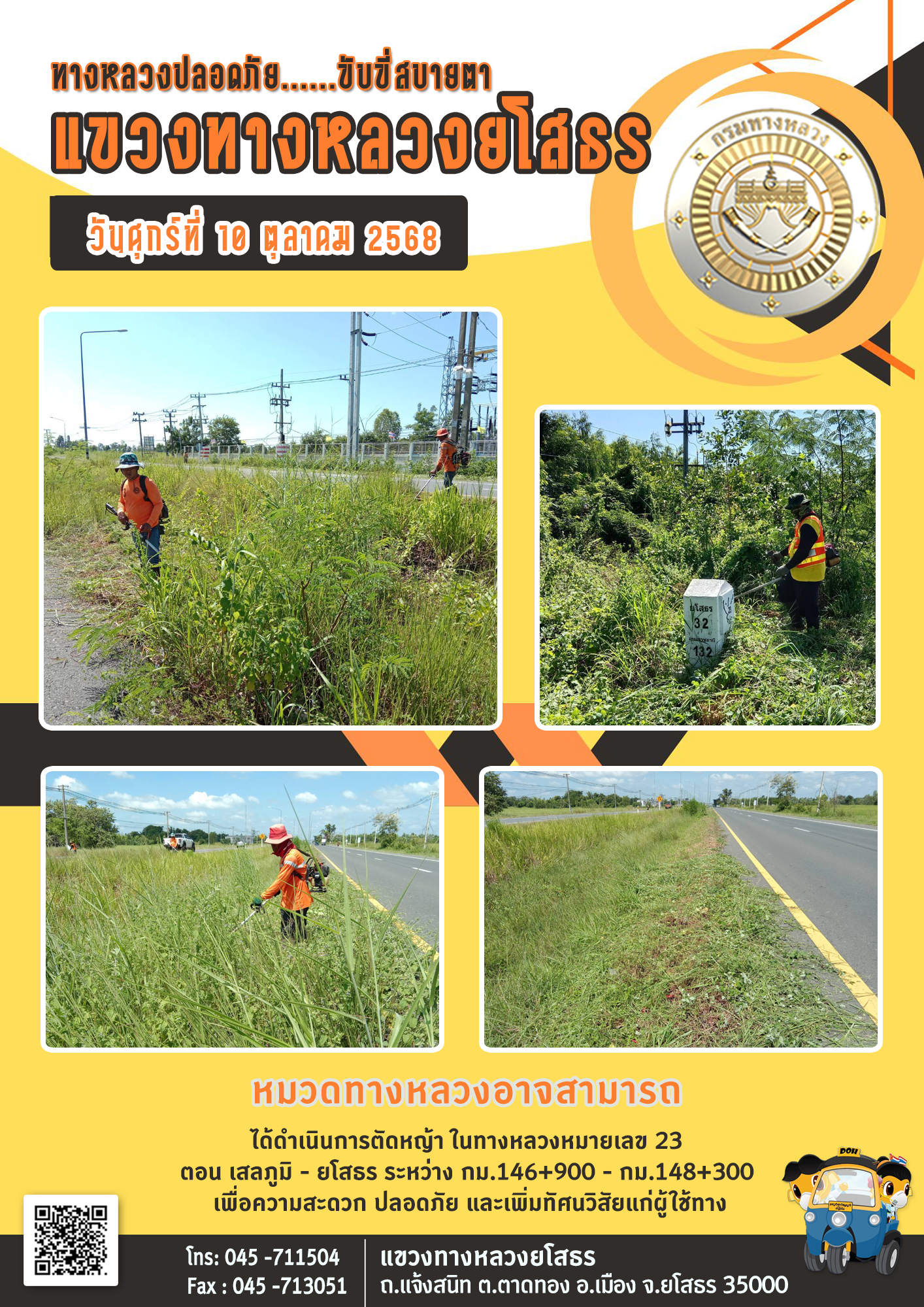 - [10:21] ทั่วไป วันอังคารที่ 31 มีนาคม 2569 งานอำนวยความปลอดภัย ได้ดำเนินการตัดหญ้า ทำความสะอาดภายในบริเวณแขวงทางหลวงยโสธร