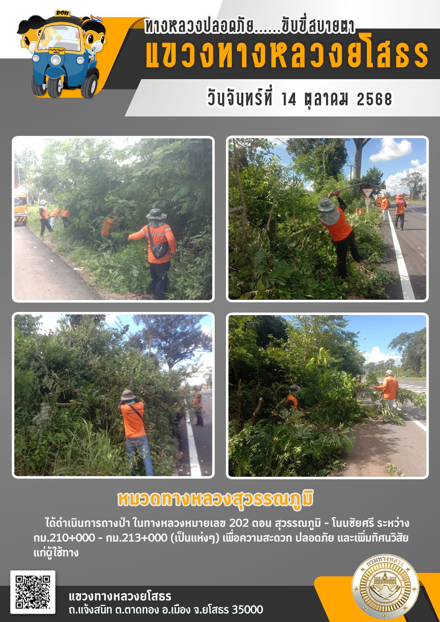 วันจันทร์ที่ 14 ตุลาคม 2568 หมวดทางหลวงสุวรรณภูมิ ได้ดำเนินการถางป่า ในทางหลวงหมายเลข 202 ตอน สุวรรณภูมิ - โนนชัยศรี ระหว่าง กม.210+000 - กม.213+000 (เป็นแห่งๆ) เพื่อความสะดวก ปลอดภัย และเพิ่มทัศนวิสัย