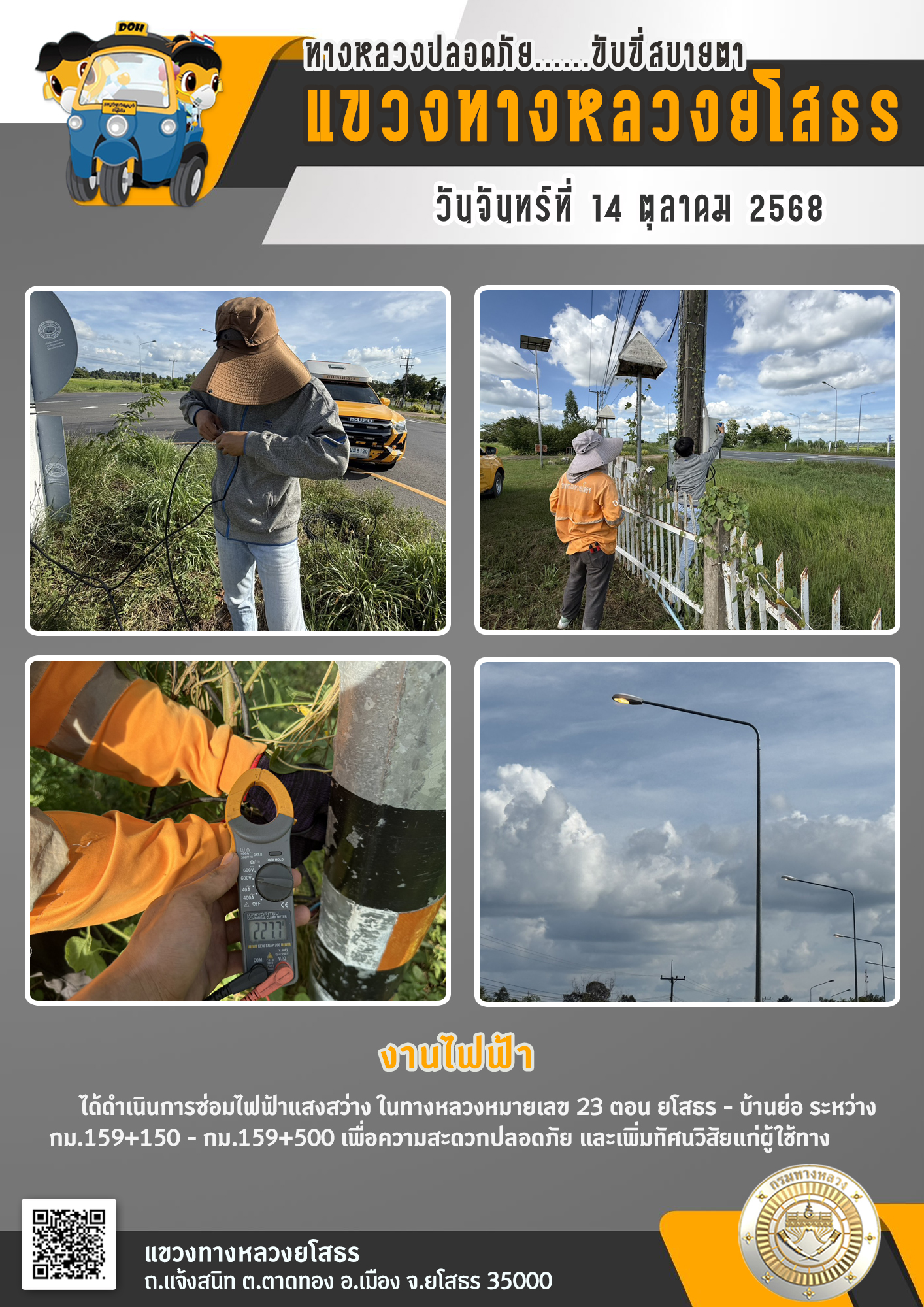 วันจันทร์ที่ 14 ตุลาคม 2568 งานไฟฟ้า ได้ดำเนินการซ่อมไฟฟ้าแสงสว่าง ในทางหลวงหมายเลข 23 ตอน ยโสรร - บ้านย่อ ระหว่าง กม.159+150 - กม.159+500 เพื่อความสะดวกปลอดภัย และเพิ่มทัศนวิสัยแก่ผู้ใช้ทาง