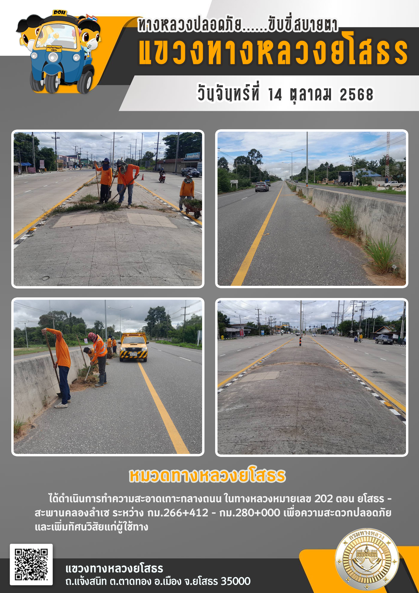 วันจันทร์ที่ 14 ตุลาคม 2568 หมวดทางหลวงยโสธร ได้ดำเนินการทำความสะอาดเกาะกลางถนน ในทางหลวงหมายเลข 202 ตอน ยโสธร - สะพานคลองลำเซ ระหว่าง กม.266+412 - กม.280+000 เพื่อความสะดวกปลอดภัย และเพิ่มทัศนวิสัยแก่ผู้ใช้ทาง