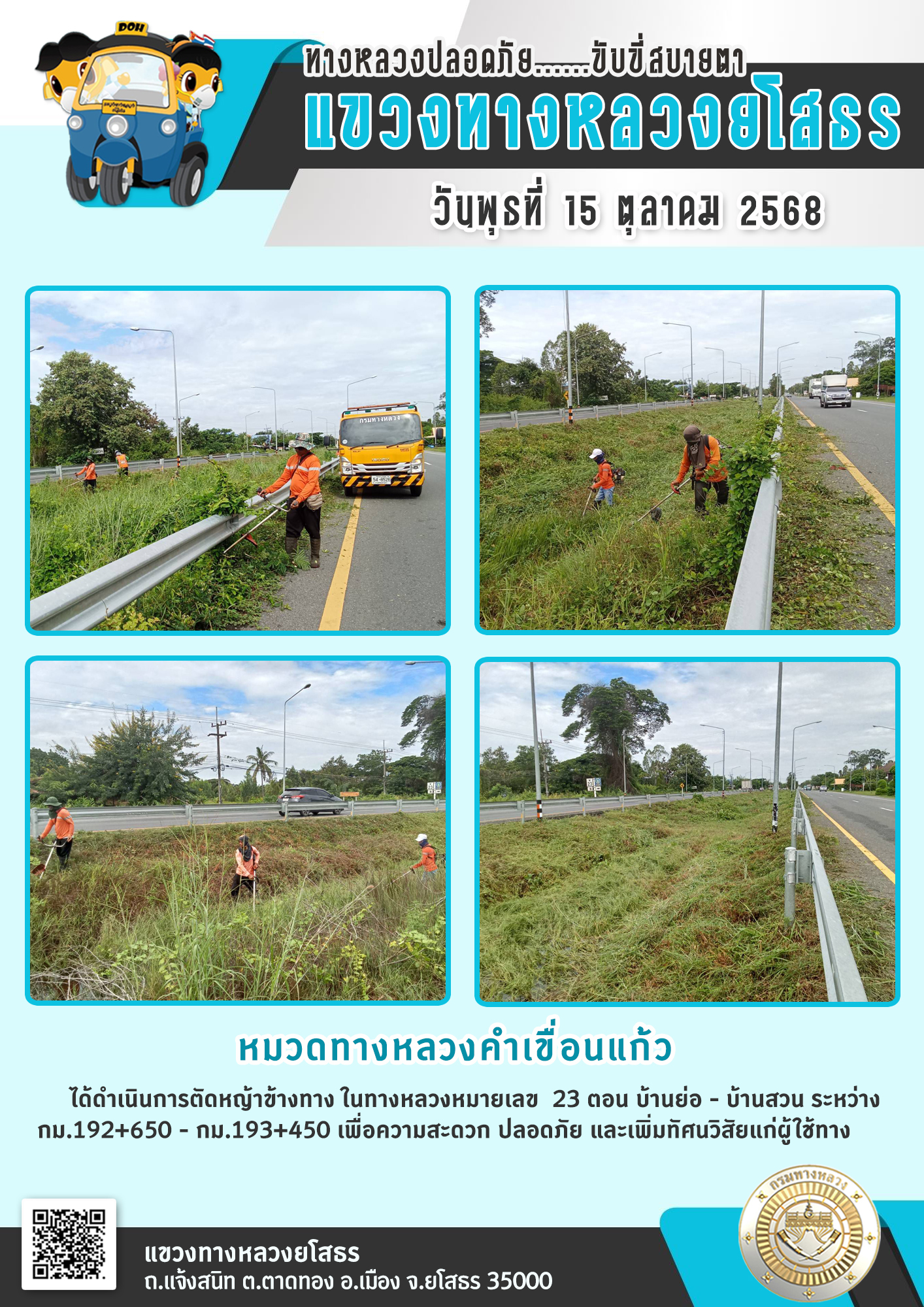 วันพุธที่ 15 ตุลาคม 2568 หมวดทางหลวงคำเขื่อนแก้ว ได้ดำเนินการตัดหญ้าข้างทาง ในทางหลวงหมายเลข 23 ตอน บ้านย่อ - บ้านสวน ระหว่าง กม.192+650 - กม.193+450 เพื่อความสะดวก ปลอดภัย และเพิ่มทัศนวิสัยแก่ผู้ใช้ทาง