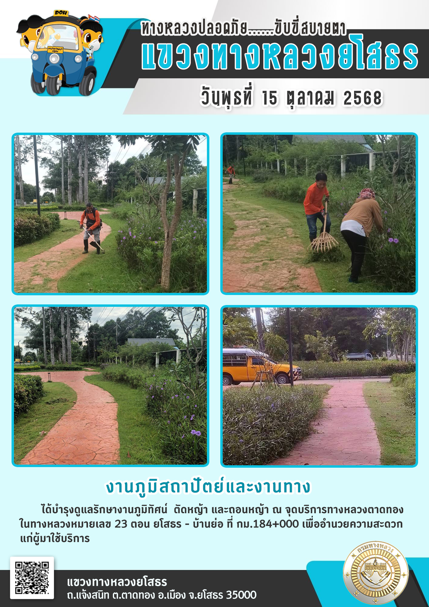 วันพุธที่ 15 ตุลาคม 2568 งานภูมิสถาปัตย์และงานทาง ได้บำรุงดูแลรักษางานภูมิทัศน์ ตัดหญ้า และถอนหญ้า ณ จุดบริการทางหลวงตาดทอง ในทางหลวงหมายเลข 23 ตอน ยโสรร - บ้านย่อ ที่ กม.184+000 เพื่ออำนวยความสะดวก แก่ผู้มาใช้บริการ
