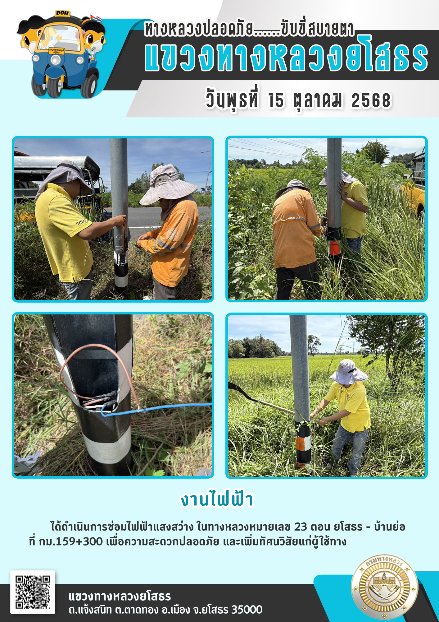 วันพุธที่ 15 ตุลาคม 2568 งานไฟฟ้า ได้ดำเนินการซ่อมไฟฟ้าแสงสว่าง ในทางหลวงหมายเลข 23 ตอน ยโสรร - บ้านย่อ ที่ กม.159+300 เพื่อความสะดวกปลอดภัย และเพิ่มทัศนวิสัยแก่ผู้ใช้ทาง
