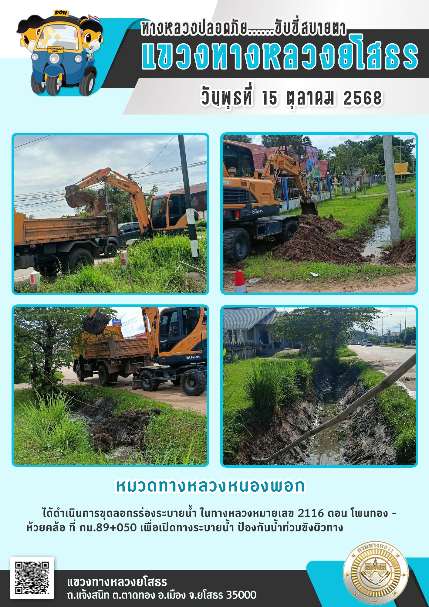 วันพุธที่ 15 ตุลาคม 2568 หมวดทางหลวงหนองพอก ได้ดำเนินการขุดลอกร่องระบายน้ำ ในทางหลวงหมายเลข 2116 ตอน โพนทอง - ห้วยคล้อ ที่ กม.89+050 เพื่อเปิดทางระบายน้ำ ป้องกันน้ำท่วมขังผิวทาง