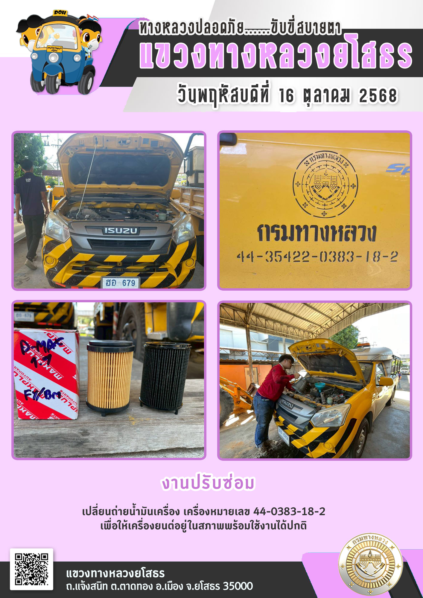 - [10:21] ทั่วไป วันอังคารที่ 31 มีนาคม 2569 งานอำนวยความปลอดภัย ได้ดำเนินการตัดหญ้า ทำความสะอาดภายในบริเวณแขวงทางหลวงยโสธร
