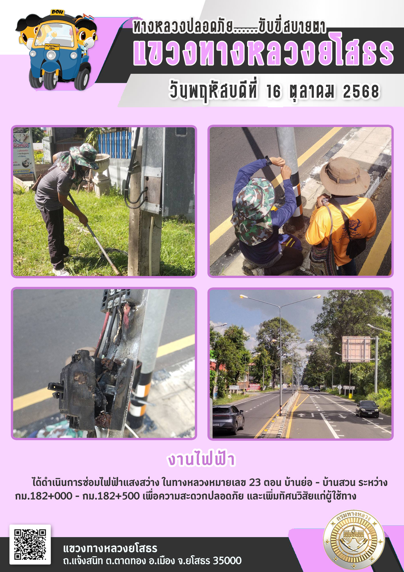 วันพฤหัสบดีที่ 16 ตุลาคม 2568 งานไฟฟ้า ได้ดำเนินการซ่อมไฟฟ้าแสงสว่าง ในทางหลวงหมายเลข 23 ตอน บ้านย่อ - บ้านสวน ระหว่าง กม.182+000 - กม.182+500 เพื่อความสะดวกปลอดภัย และเพิ่มทัศนวิสัยแก่ผู้ใช้ทาง