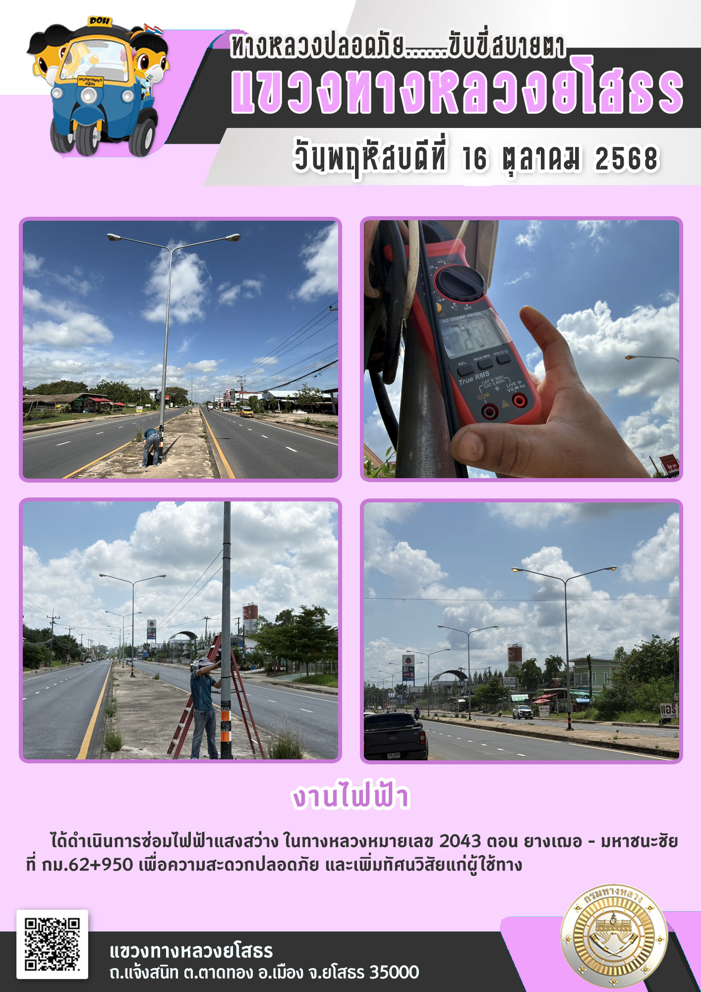 วันพฤหัสบดีที่ 16 ตุลาคม 2568 งานไฟฟ้า ได้ดำเนินการซ่อมไฟฟ้าแสงสว่าง ในทางหลวงหมายเลข 2043 ตอน ยางเฌอ - มหาชนะชัย ที่ กม.62+950 เพื่อความสะดวกปลอดภัย และเพิ่มทัศนวิสัยแก่ผู้ใช้ทาง