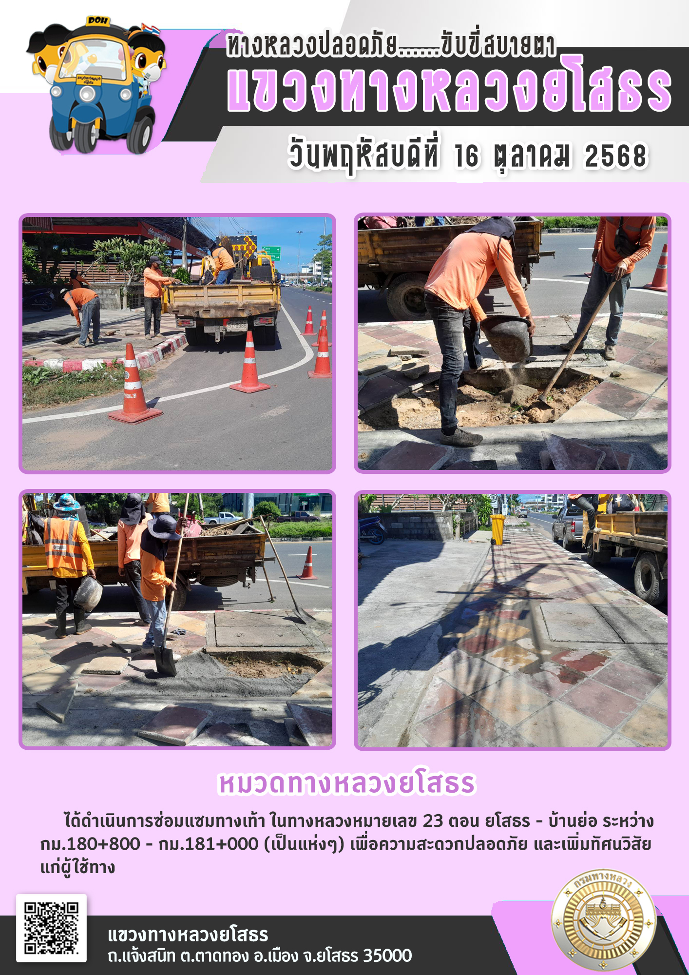 วันพฤหัสบดีที่ 16 ตุลาคม 2568 หมวดทางหลวงยโสธร ได้ดำเนินการซ่อมแซมทางเท้า ในทางหลวงหมายเลข 23 ตอน ยโสรร - บ้านย่อ ระหว่าง กม.180+800 - กม.181+000 (เป็นแห่งๆ) เพื่อความสะดวกปลอดภัย และเพิ่มทัศนวิสัย