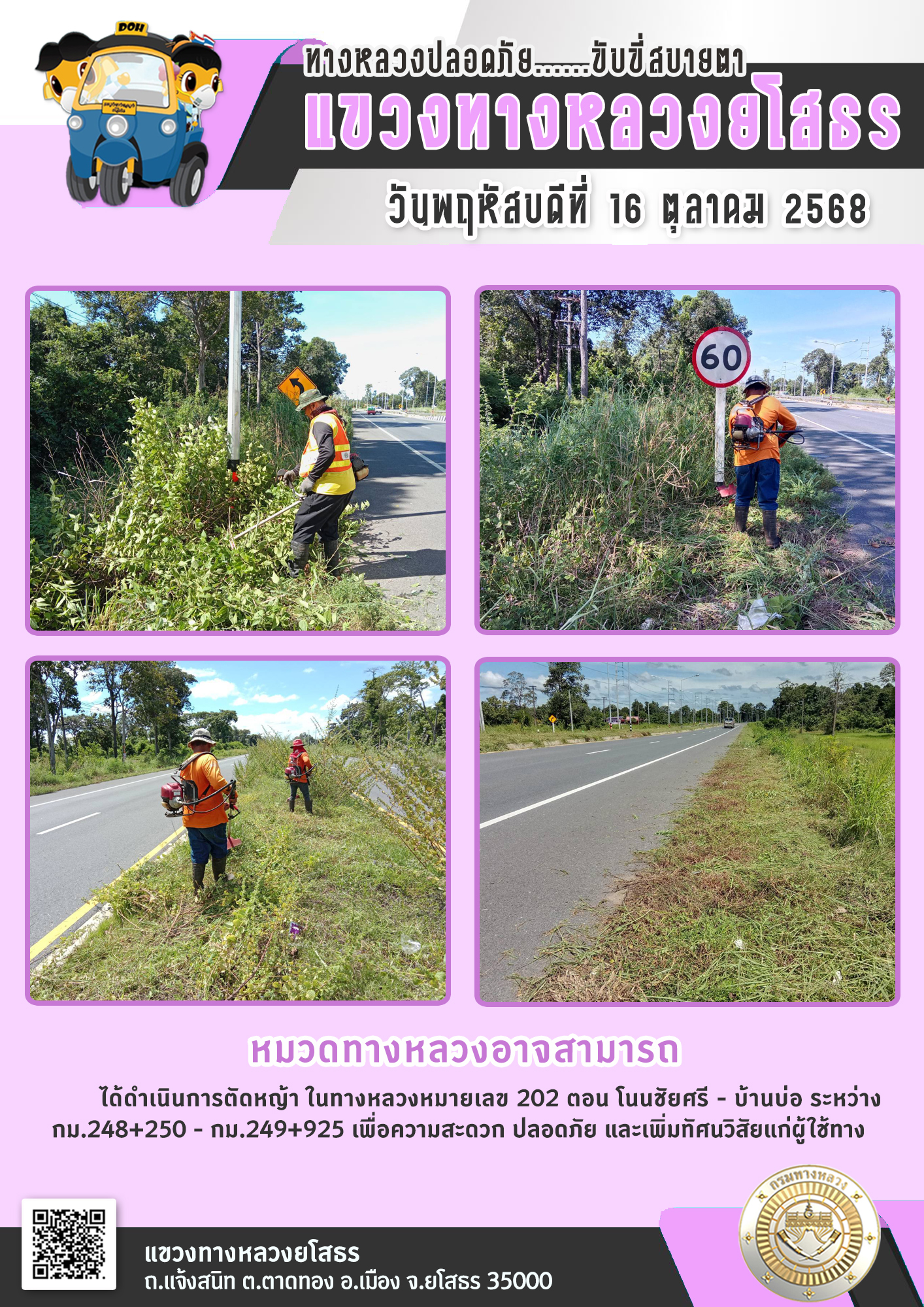 วันพฤหัสบดีที่ 16 ตุลาคม 2568 หมวดทางหลวงอาจสามารถ ได้ดำเนินการตัดหญ้า ในทางหลวงหมายเลข 202 ตอน โนนชัยศรี - บ้านบ่อ ระหว่าง กม.248+250 - กม.249+925 เพื่อความสะดวก ปลอดภัย และเพิ่มทัศนวิสัยแก่ผู้ใช้ทาง