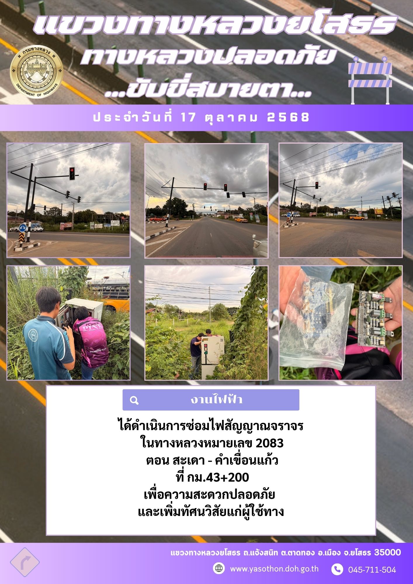 วันที่ 17 ตุลาคม 2568 งานไฟฟ้า ได้ดำเนินการซ่อมไฟสัญญาณจราจร ในทางหลวงหมายเลข 2083 ตอน สะเดา - คำเขื่อนแก้ว ที่ กม.43+200 เพื่อความสะดวกปลอดภัย และเพิ่มทัศนวิสัยแก่ผู้ใช้ทาง