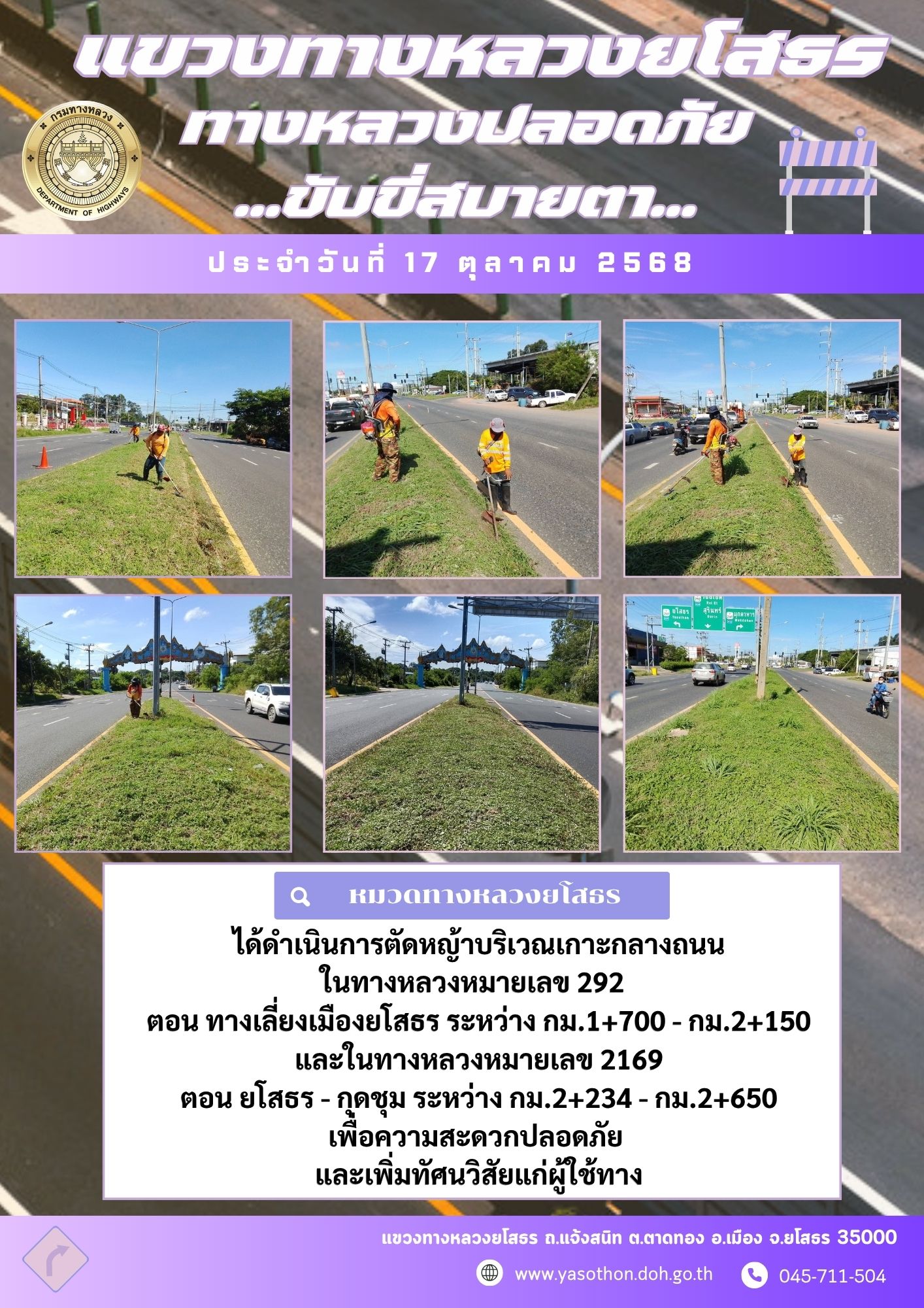 วันที่ 17 ตุลาคม 2568 หมวดทางหลวงยโสธร ได้ดำเนินการตัดหญ้าบริเวณเกาะกลางถนน ในทางหลวงหมายเลข 292 ตอน ทางเลี่ยงเมืองยโสธร ระหว่าง กม.1+700 - กม.2+150 และทางหลวงหมายเลข 2169 ตอน ยโสธร - กุดชุม ระหว่าง กม.2+234 - กม.2+650 เพื่อความสะดวกปลอดภัย และเพิ่มท