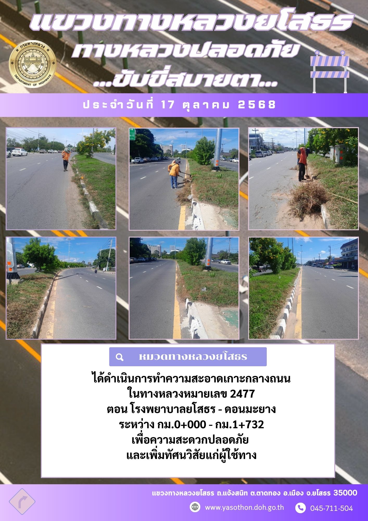 วันที่ 17 ตุลาคม 2568 หมวดทางหลวงยโสธร ได้ดำเนินการทำความสะอาดเกาะกลางถนน ในทางหลวงหมายเลข 2477 ตอน โรงพยาบาลยโสธร - ดอนมะยาง ระหว่าง กม.0+000 - กม.1+732 เพื่อความสะดวกปลอดภัย และเพิ่มทัศนวิสัยแก่ผู้ใช้ทาง