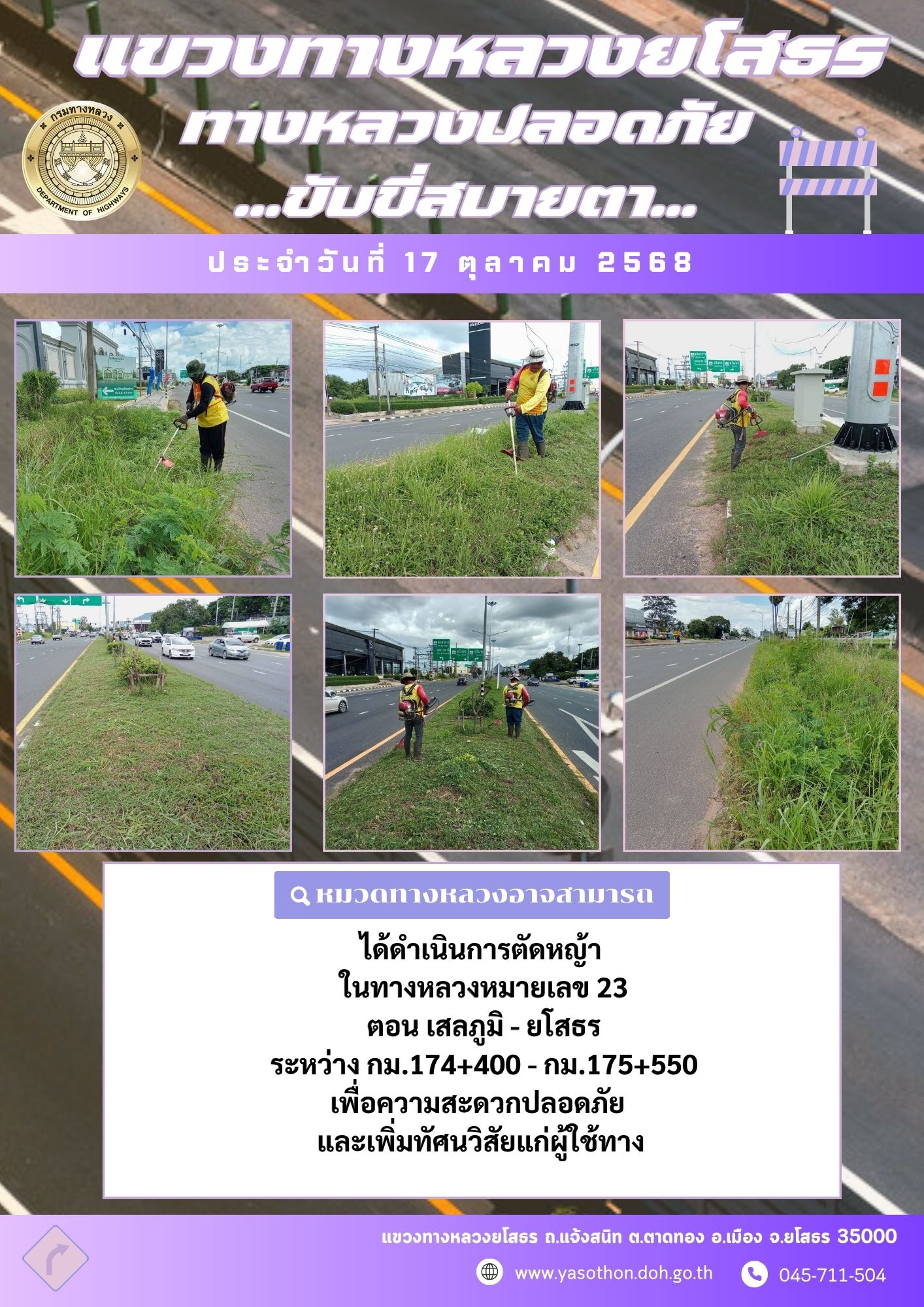 วันที่ 17 ตุลาคม 2568 หมวดทางหลวงอาจสามารถ ได้ดำเนินการตัดหญ้า ในทางหลวงหมายเลข 23 ตอน เสลภูมิ - ยโสธร ระหว่าง กม.174+400 - กม.175+550 เพื่อความสะดวกปลอดภัย และเพิ่มทัศนวิสัยแก่ผู้ใช้ทาง