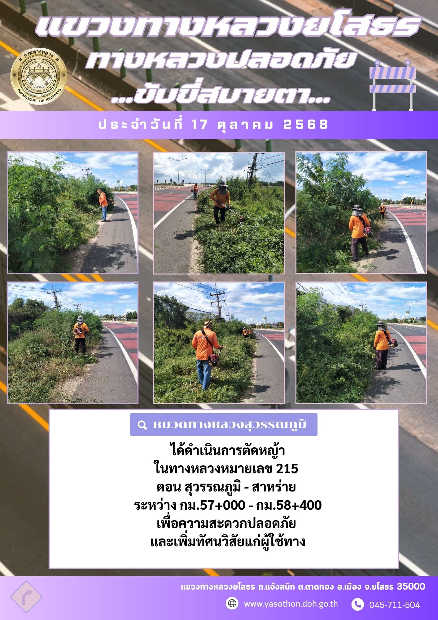 วันที่ 17 ตุลาคม 2568 หมวดทางหลวงสุวรรณภูมิ ได้ดำเนินการตัดหญ้า ในทางหลวงหมายเลข 215 ตอน สุวรรณภูมิ - สาหร่าย ระหว่าง กม.57+000 - กม.58+400 เพื่อความสะดวกปลอดภัย และเพิ่มทัศนวิสัยแก่ผู้ใช้ทาง